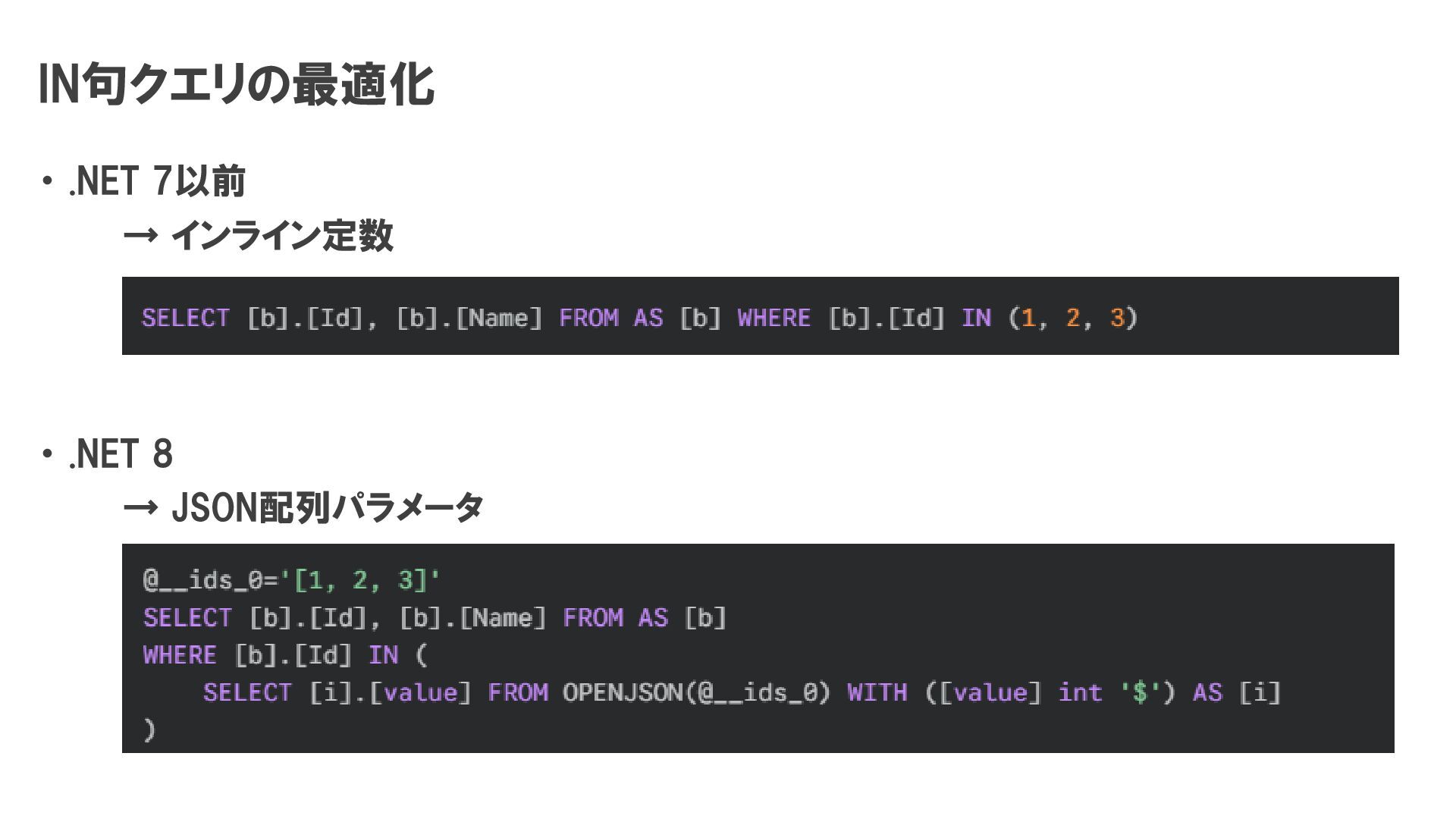 IN句クエリの最適化 ・ .NET 7以前 → インライン定数 ・ .NET 8 →