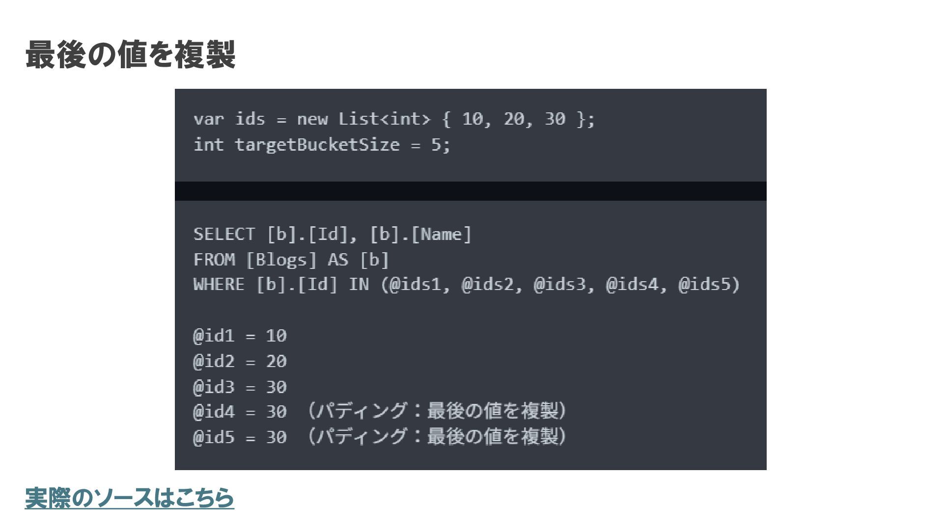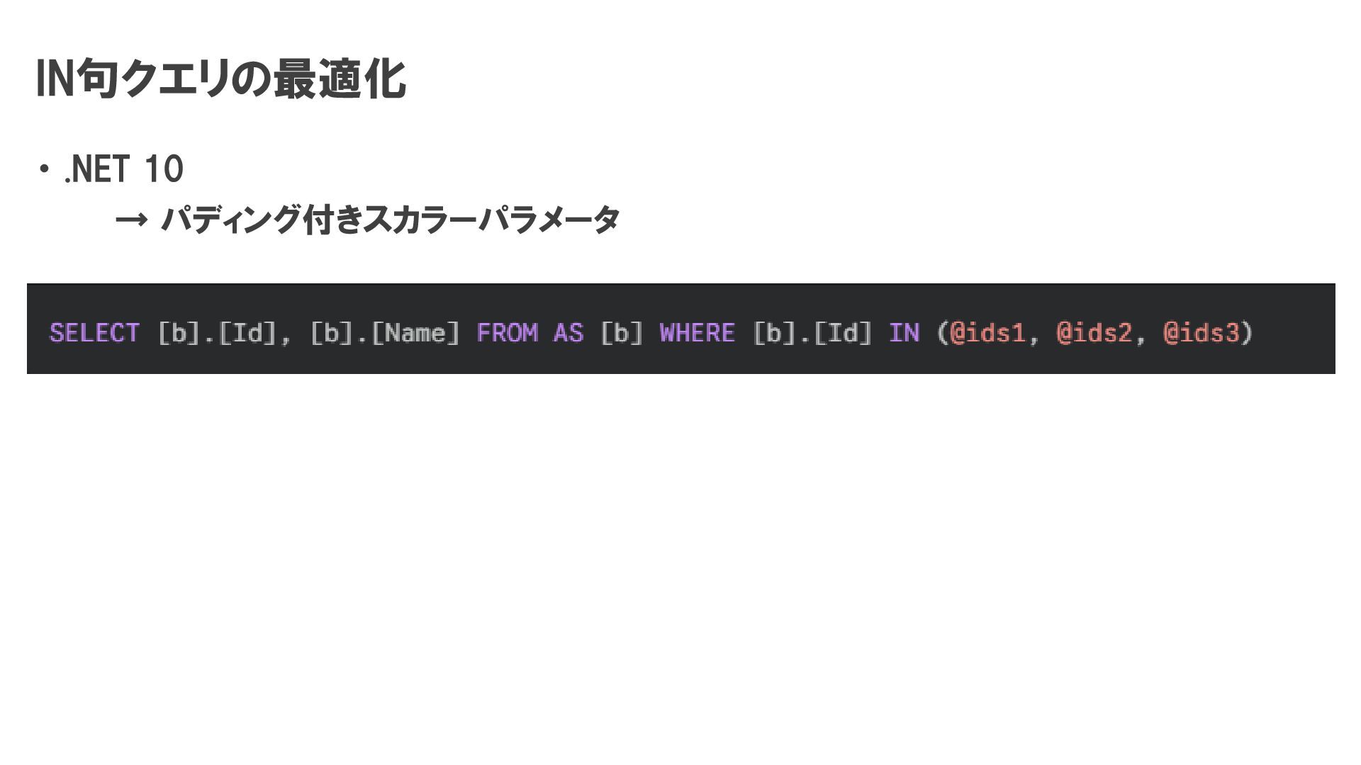 IN句クエリの最適化 ・ .NET 10 → パディング付きスカラーパラメータ