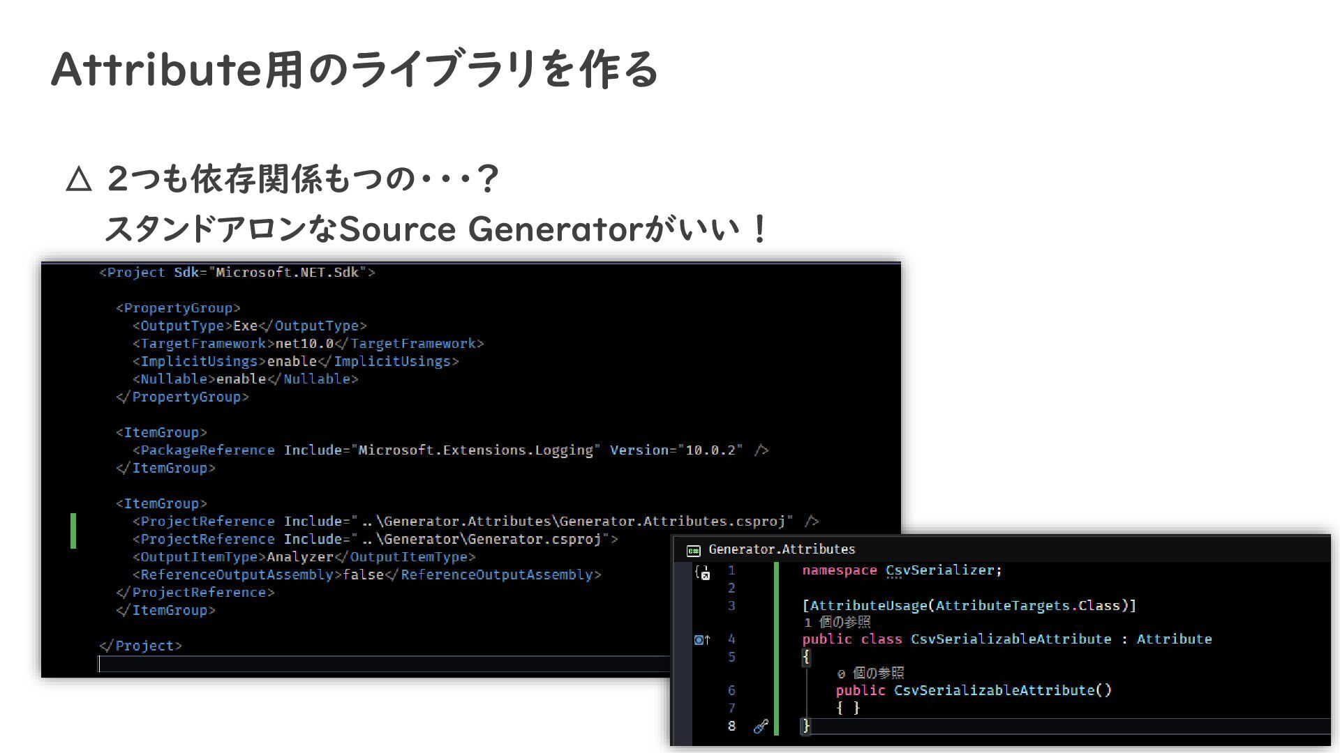 Attribute用のライブラリを作る △ 2つも依存関係もつの・・・? スタンドアロンなSource Generatorがいい !
