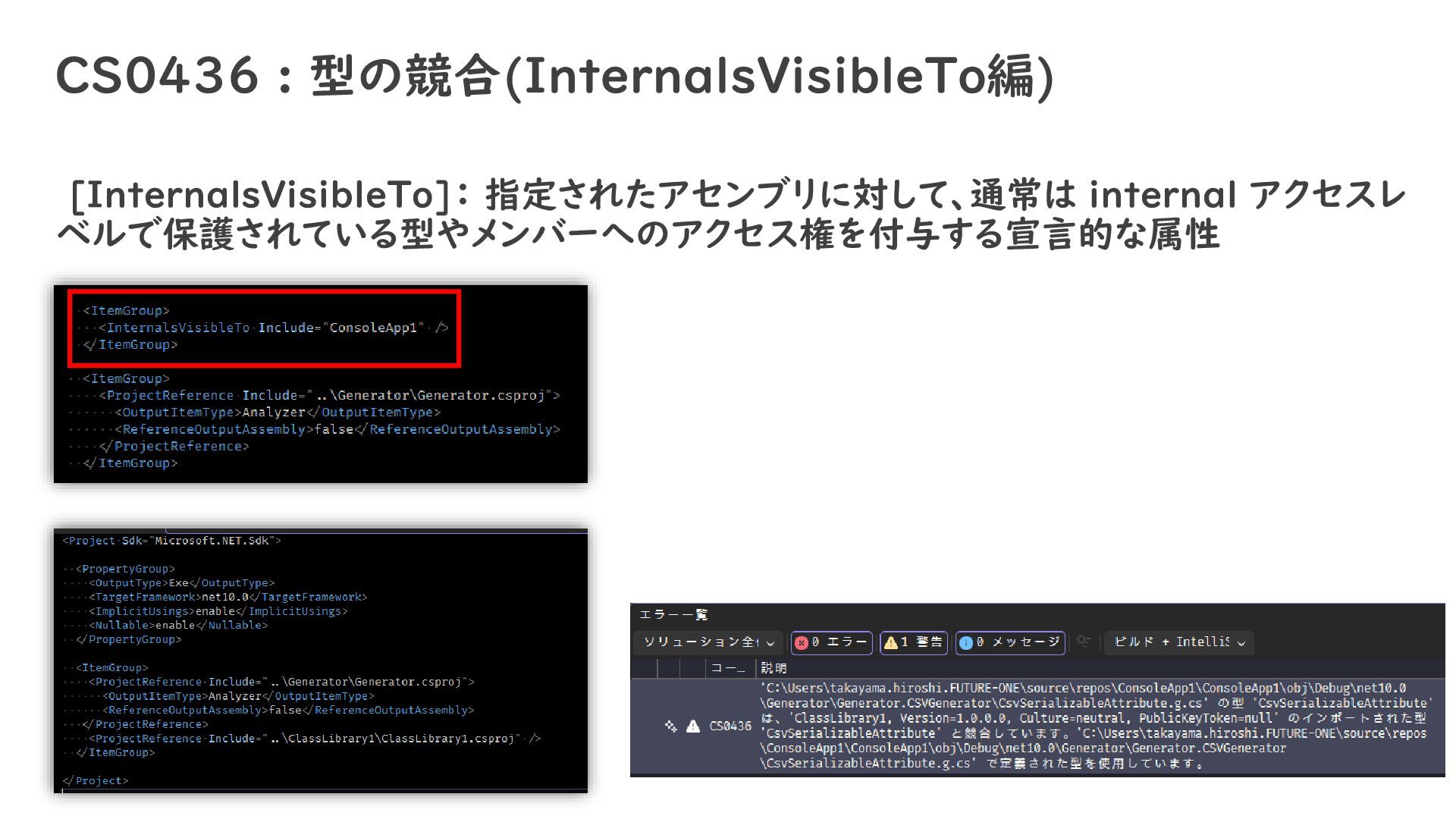 CS0436 : 型の競合(InternalsVisibleTo編) [InternalsVisibleTo]: 指定されたアセンブリに対して、通常は internal アクセスレ ベルで保護されている型やメンバーへのアクセス権を付与する宣言的な属性