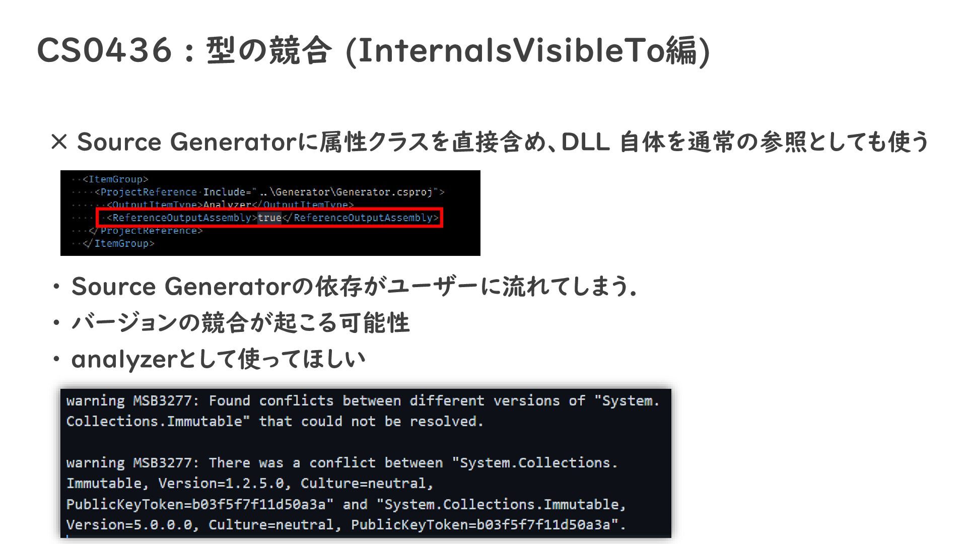 CS0436 : 型の競合 (InternalsVisibleTo編) × Source Generatorに属性クラスを直接含め、DLL 自体を通常の参照としても使う ・ Source