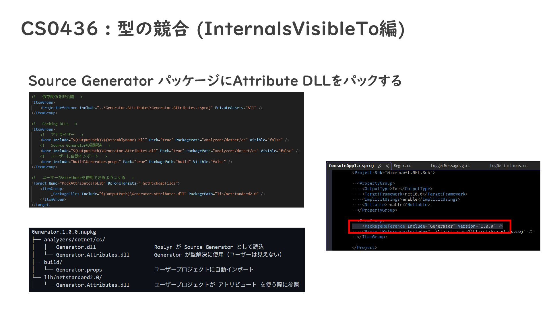 CS0436 : 型の競合 (InternalsVisibleTo編) Source Generator パッケージにAttribute DLLをパックする