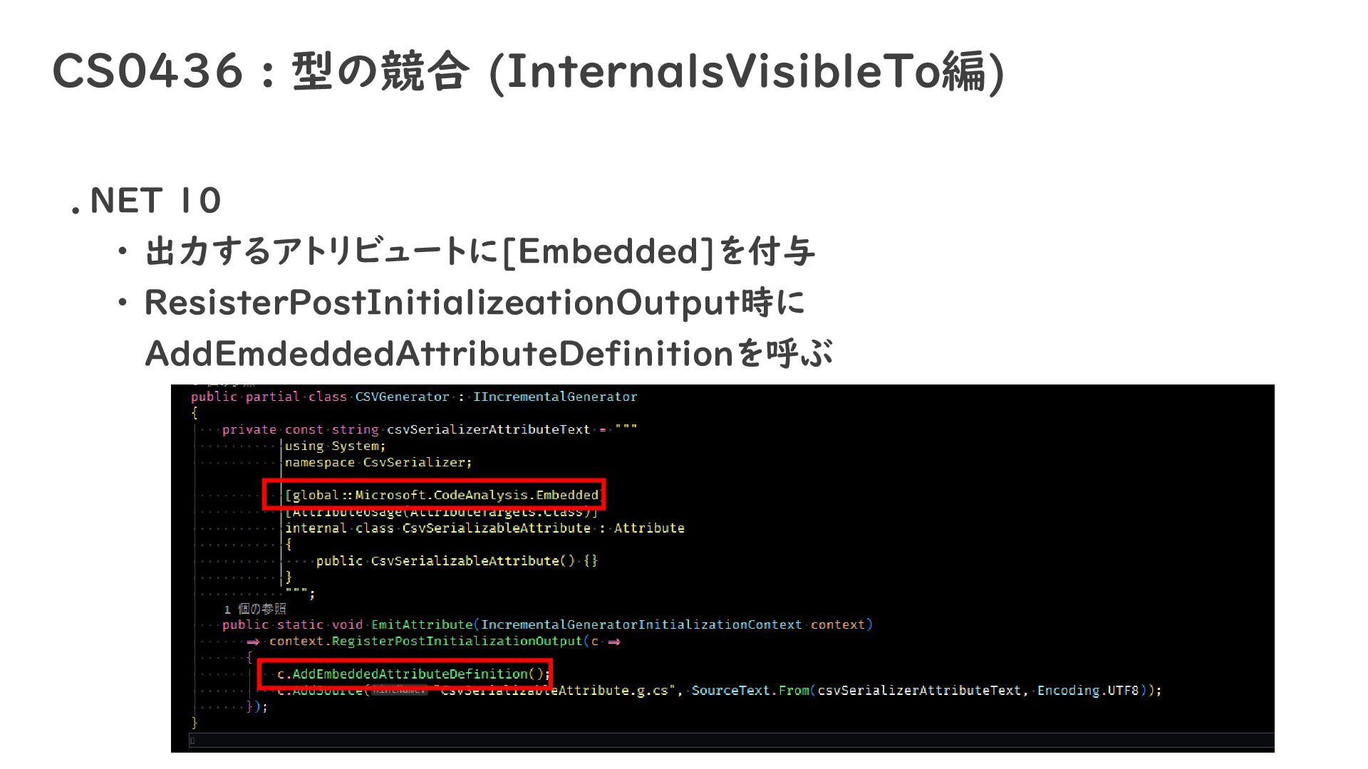 CS0436 : 型の競合 (InternalsVisibleTo編) .NET 10 ・ 出力するアトリビュートに[Embedded]を付与 ・ ResisterPostInitializeationOutput時に
