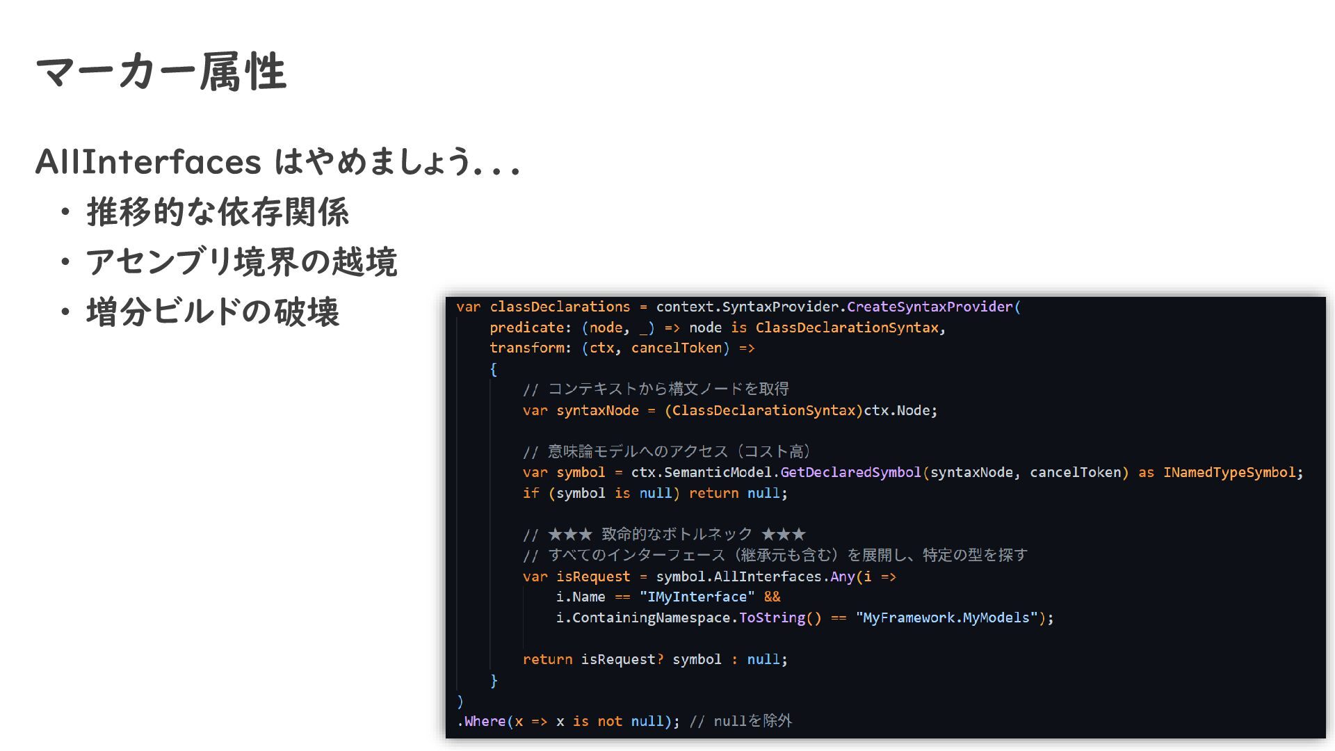 マーカー属性 AllInterfaces はやめましょう... ・ 推移的な依存関係 ・ アセンブリ境界の越境 ・ 増分ビルドの破壊