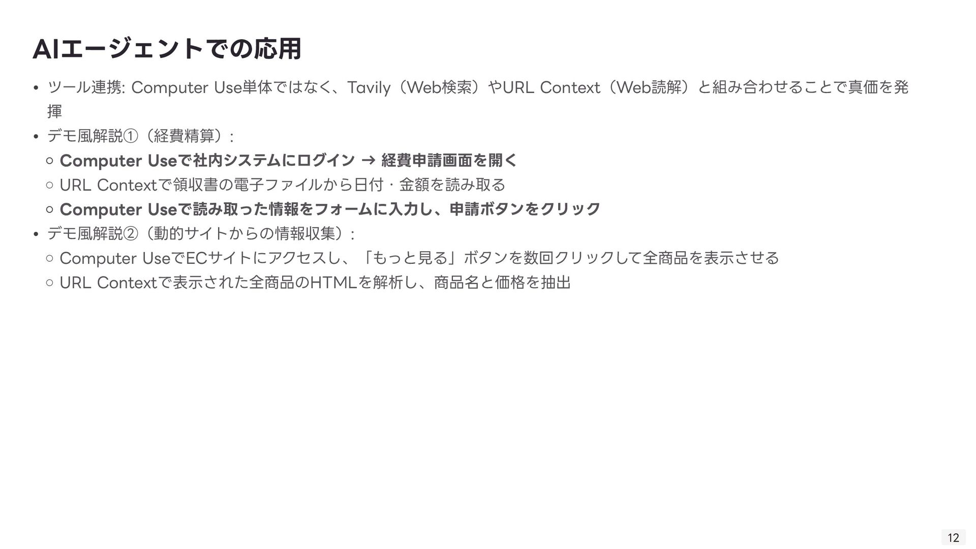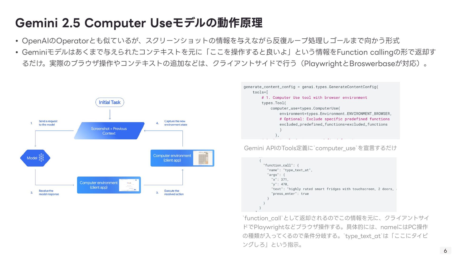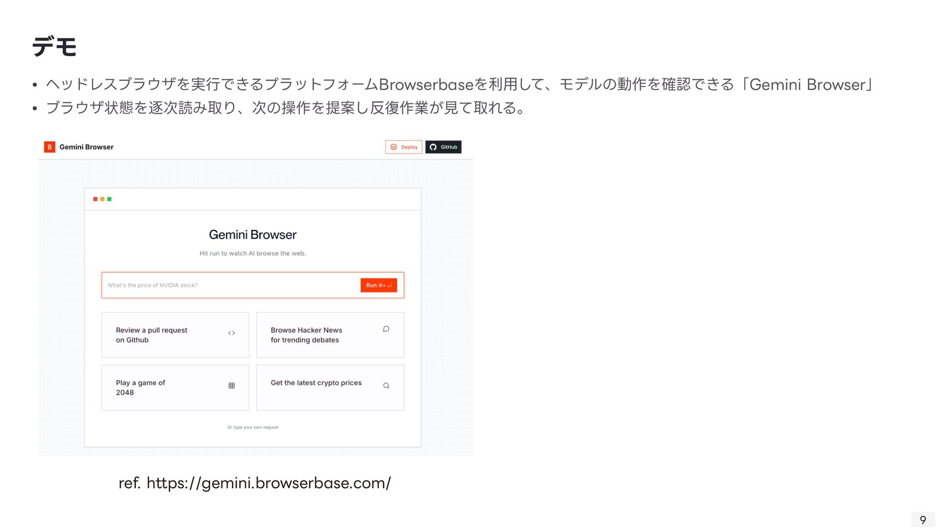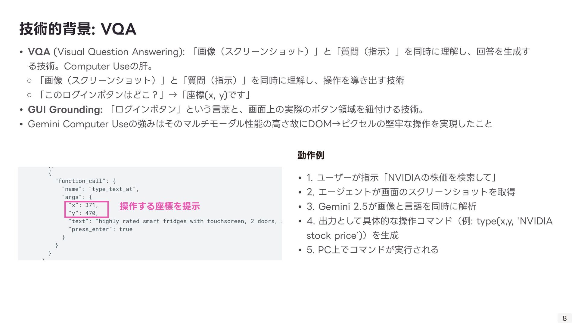 る技術。Computer Useの肝。 ◦ 「画像(スクリーンショット)」と「質問(指 示 )」を同時に理解し、操作を導き出す技術 ◦ 「このログインボタンはどこ?」→「座標(x, y)です」 • GUI Grounding: 「ログインボタン」という 言 葉と、画 面 上の実際のボタン領域を紐付ける技術。 • Gemini Computer Useの強みはそのマルチモーダル性能の 高 さ故にDOM→ピクセルの堅牢な操作を実現したこと 技術的背景: VQA 8 • 1. ユーザーが指 示 「NVIDIAの株価を検索して」 • 2. エージェントが画 面 のスクリーンショットを取得 • 3. Gemini 2.5が画像と 言 語を同時に解析 • 4. 出 力 として具体的な操作コマンド(例: type(x,y, 'NVIDIA stock price ’ ))を 生 成 • 5. PC上でコマンドが実 行 される 動作例 操作する座標を提 示