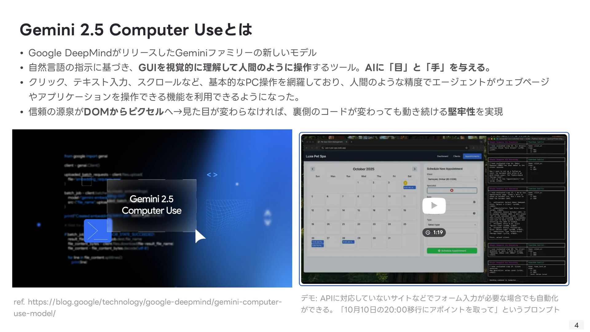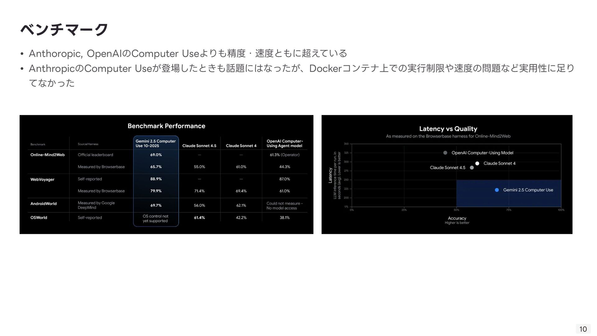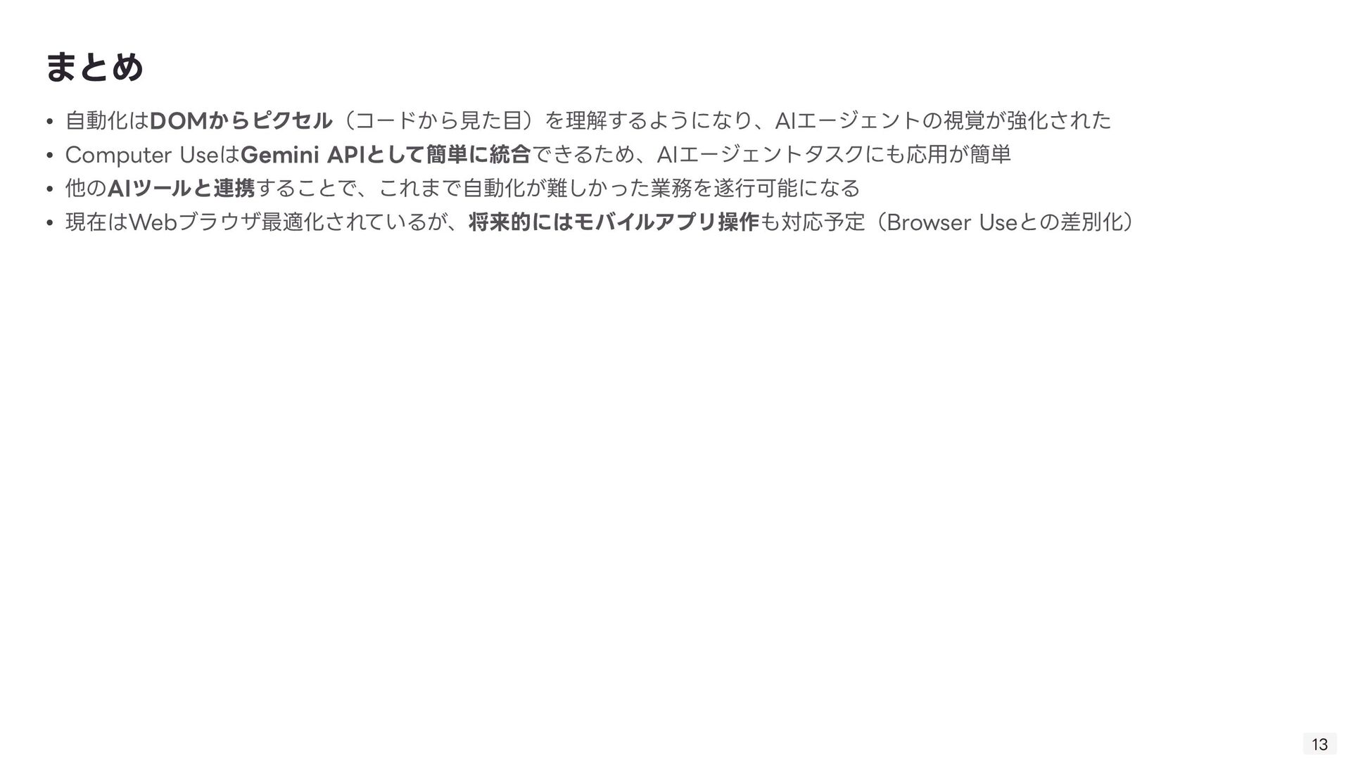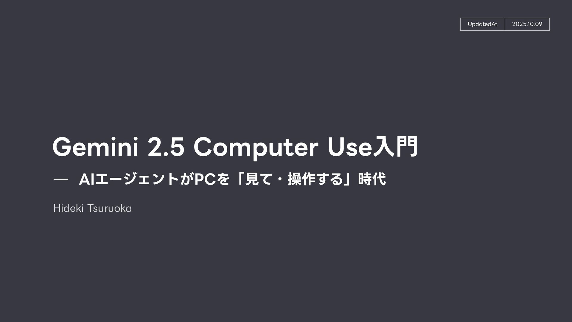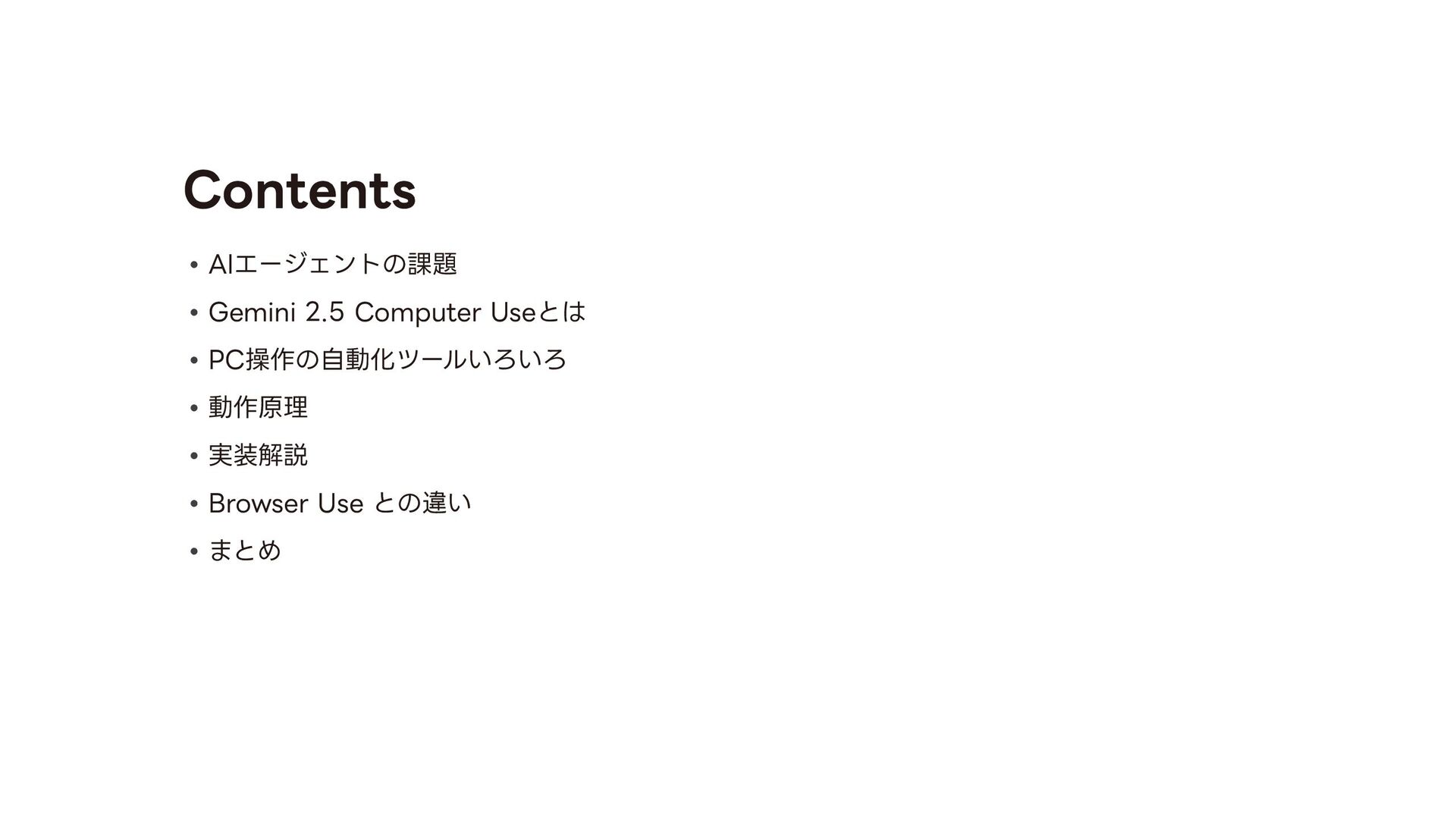 る技術。Computer Useの肝。 ◦ 「画像(スクリーンショット)」と「質問(指 示 )」を同時に理解し、操作を導き出す技術 ◦ 「このログインボタンはどこ?」→「座標(x, y)です」 • GUI Grounding: 「ログインボタン」という 言 葉と、画 面 上の実際のボタン領域を紐付ける技術。 • Gemini Computer Useの強みはそのマルチモーダル性能の 高 さ故にDOM→ピクセルの堅牢な操作を実現したこと 技術的背景: VQA 8 • 1. ユーザーが指 示 「NVIDIAの株価を検索して」 • 2. エージェントが画 面 のスクリーンショットを取得 • 3. Gemini 2.5が画像と 言 語を同時に解析 • 4. 出 力 として具体的な操作コマンド(例: type(x,y, 'NVIDIA stock price ’ ))を 生 成 • 5. PC上でコマンドが実 行 される 動作例 操作する座標を提 示