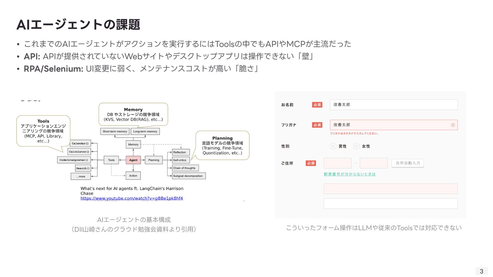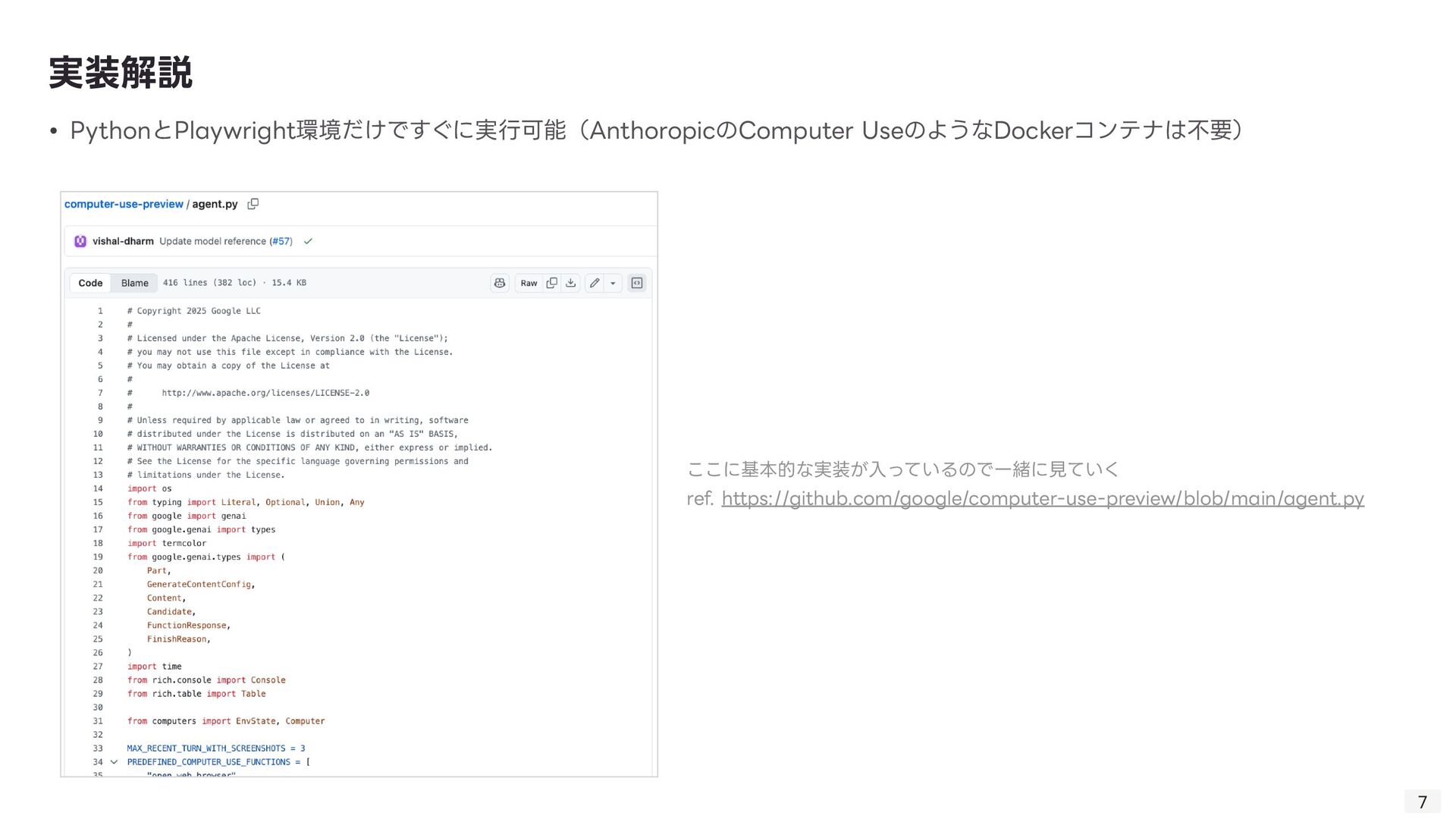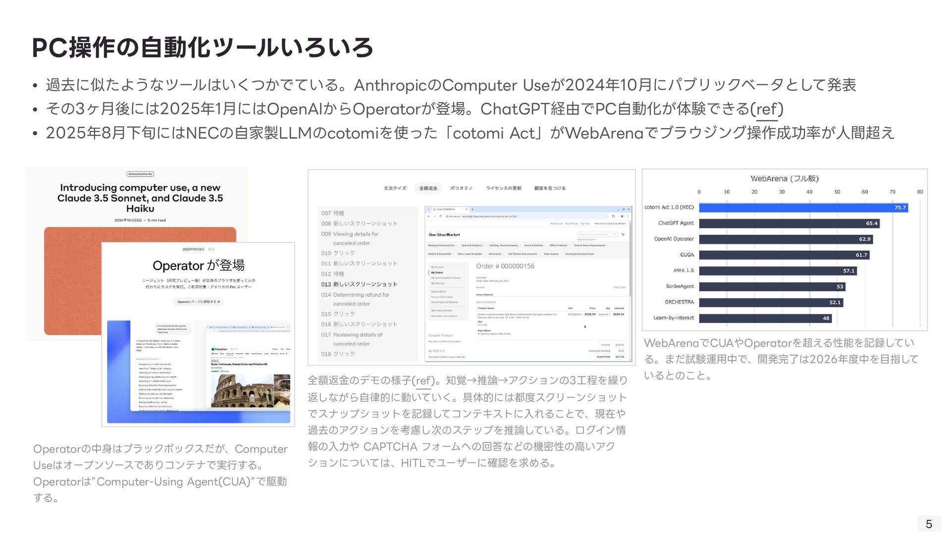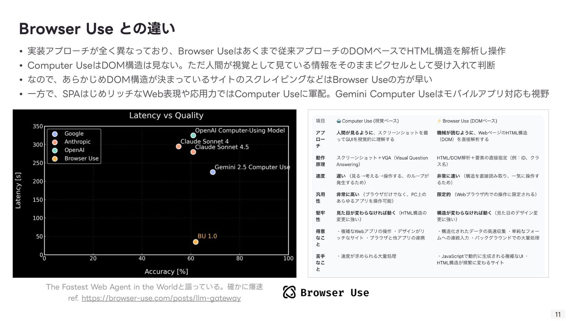 る技術。Computer Useの肝。 ◦ 「画像(スクリーンショット)」と「質問(指 示 )」を同時に理解し、操作を導き出す技術 ◦ 「このログインボタンはどこ?」→「座標(x, y)です」 • GUI Grounding: 「ログインボタン」という 言 葉と、画 面 上の実際のボタン領域を紐付ける技術。 • Gemini Computer Useの強みはそのマルチモーダル性能の 高 さ故にDOM→ピクセルの堅牢な操作を実現したこと 技術的背景: VQA 8 • 1. ユーザーが指 示 「NVIDIAの株価を検索して」 • 2. エージェントが画 面 のスクリーンショットを取得 • 3. Gemini 2.5が画像と 言 語を同時に解析 • 4. 出 力 として具体的な操作コマンド(例: type(x,y, 'NVIDIA stock price ’ ))を 生 成 • 5. PC上でコマンドが実 行 される 動作例 操作する座標を提 示