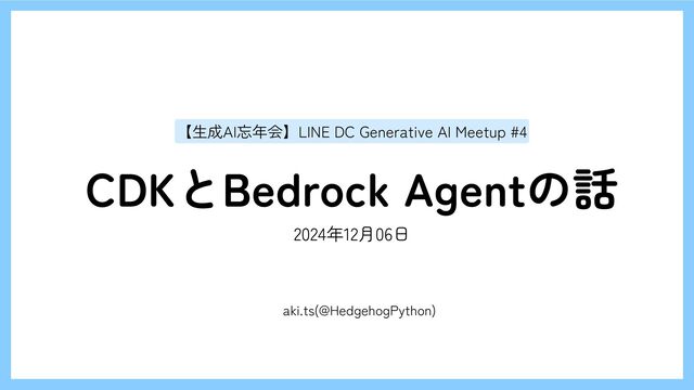 CDKとBedrock Agentの話 2024年12月06日 【生成AI忘年会】LINE DC Generative AI Meetup #4 aki.ts(@HedgehogPython)