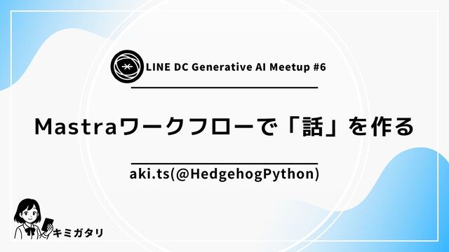 キミガタリ LINE DC Generative AI Meetup #6 Mastraワークフローで「話」を作る aki.ts(@HedgehogPython)
