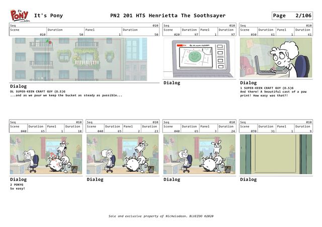 Dialog Seq 140 Scene 120 Duration 41 Panel 4 Duration 8 Dialog Seq 140 Scene 130 Duration 20 Panel 1 Duration 20 Dialog Seq 140 Scene 140 Duration 24 Panel 1 Duration 14 Dialog Seq 140 Scene 140 Duration 24 Panel 2 Duration 4 Dialog Seq 140 Scene 140 Duration 24 Panel 3 Duration 6 Dialog Seq 140 Scene 150 Duration 223 Panel 1 Duration 17 Dialog It's Pony Page 82/106 PN2 201 HTS Henrietta The Soothsayer Sole and exclusive property of Nickelodeon. BLUEZOO ©2020