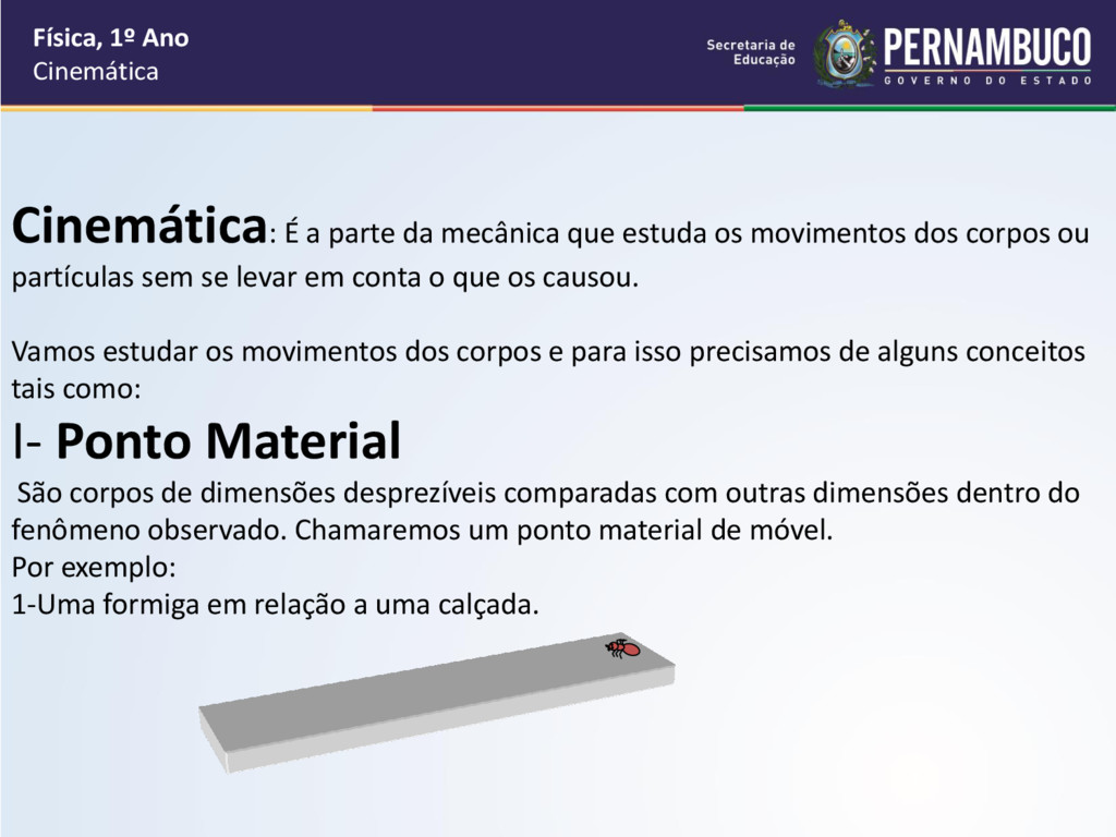 que estuda os movimentos dos corpos ou partículas sem se levar em conta o que os causou. Vamos estudar os movimentos dos corpos e para isso precisamos de alguns conceitos tais como: I- Ponto Material São corpos de dimensões desprezíveis comparadas com outras dimensões dentro do fenômeno observado. Chamaremos um ponto material de móvel. Por exemplo: 1-Uma formiga em relação a uma calçada.