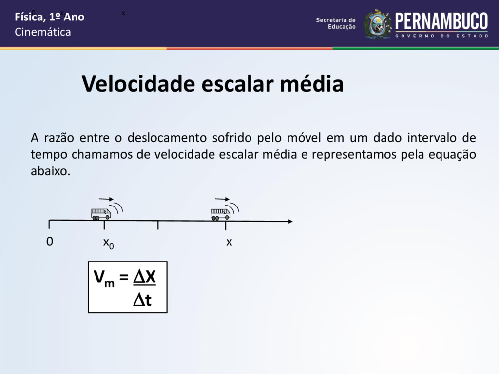 o deslocamento sofrido pelo móvel em um dado intervalo de tempo chamamos de velocidade escalar média e representamos pela equação abaixo. 0 x 0 x 0 x0 x Vm = X t
