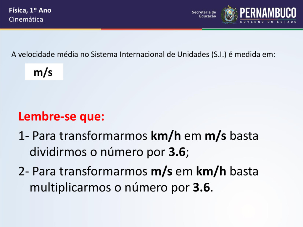 medida em: Lembre-se que: 1- Para transformarmos km/h em m/s basta dividirmos o número por 3.6; 2- Para transformarmos m/s em km/h basta multiplicarmos o número por 3.6. Física, 1º Ano Cinemática m/s