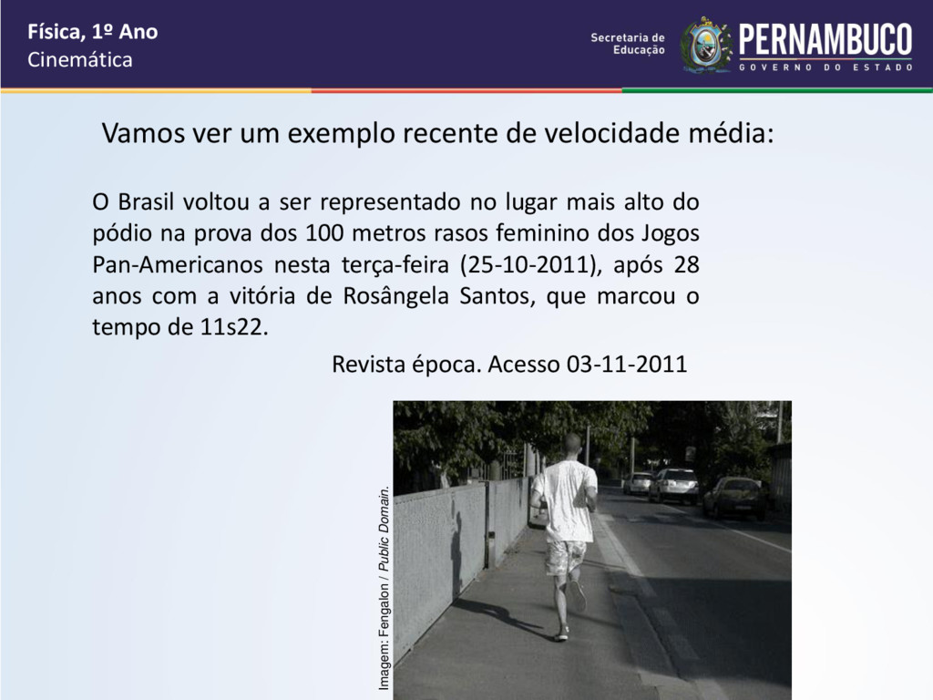 Ano Cinemática O Brasil voltou a ser representado no lugar mais alto do pódio na prova dos 100 metros rasos feminino dos Jogos Pan-Americanos nesta terça-feira (25-10-2011), após 28 anos com a vitória de Rosângela Santos, que marcou o tempo de 11s22. Revista época. Acesso 03-11-2011 Imagem: Fengalon / Public Domain.