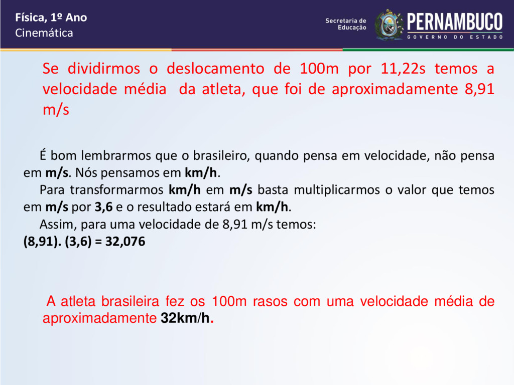 velocidade média da atleta, que foi de aproximadamente 8,91 m/s Física, 1º Ano Cinemática É bom lembrarmos que o brasileiro, quando pensa em velocidade, não pensa em m/s. Nós pensamos em km/h. Para transformarmos km/h em m/s basta multiplicarmos o valor que temos em m/s por 3,6 e o resultado estará em km/h. Assim, para uma velocidade de 8,91 m/s temos: (8,91). (3,6) = 32,076 A atleta brasileira fez os 100m rasos com uma velocidade média de aproximadamente 32km/h.