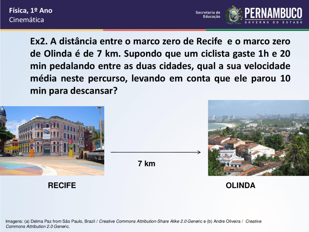 o marco zero de Olinda é de 7 km. Supondo que um ciclista gaste 1h e 20 min pedalando entre as duas cidades, qual a sua velocidade média neste percurso, levando em conta que ele parou 10 min para descansar? Física, 1º Ano Cinemática RECIFE 7 km OLINDA Imagens: (a) Delma Paz from São Paulo, Brazil / Creative Commons Attribution-Share Alike 2.0 Generic e (b) Andre Oliveira / Creative Commons Attribution 2.0 Generic.