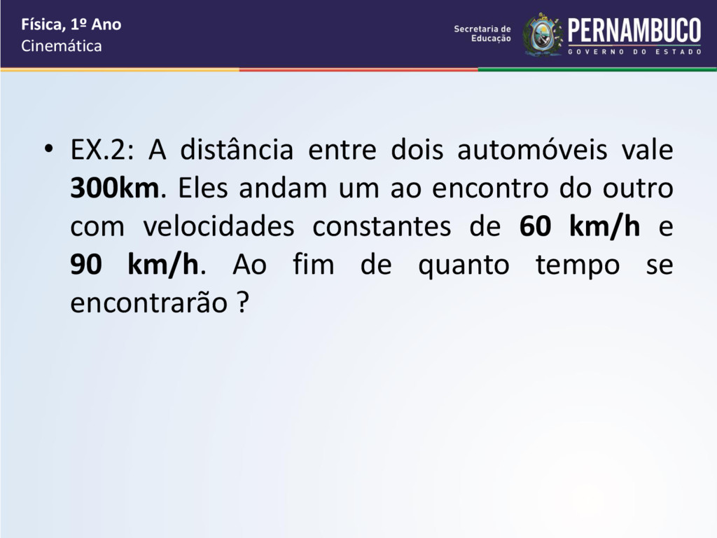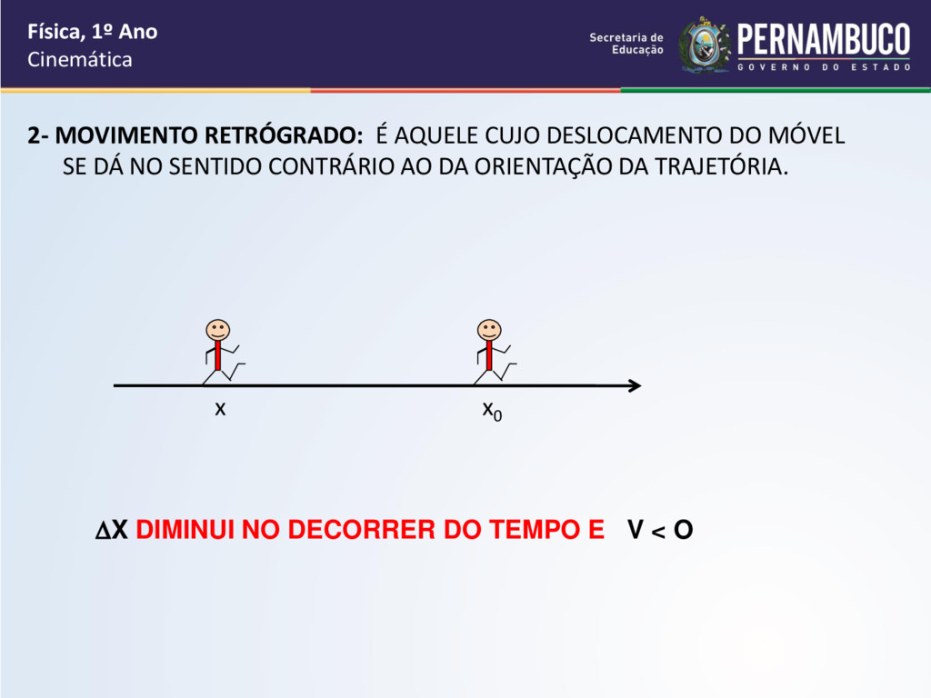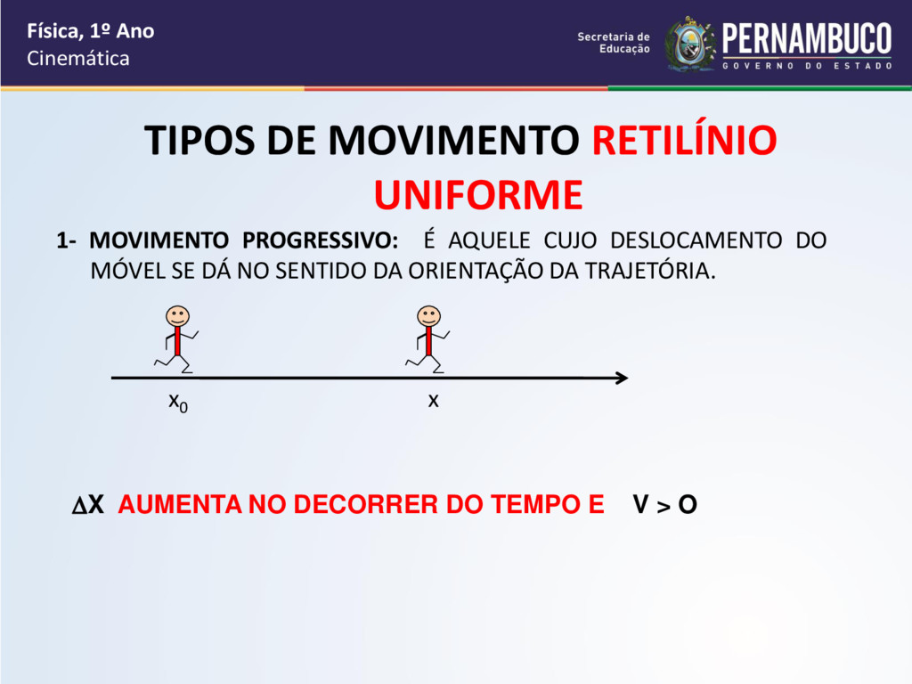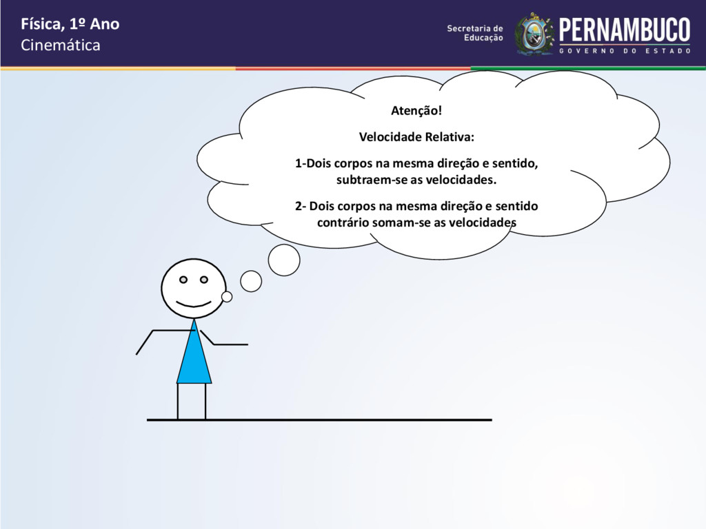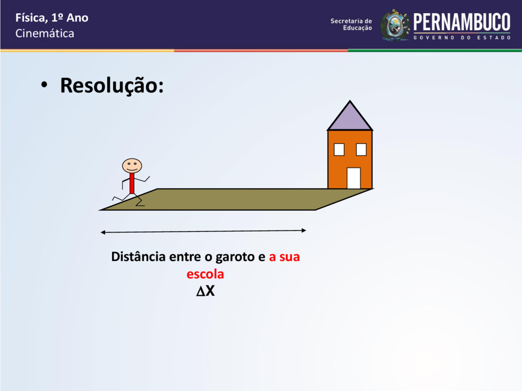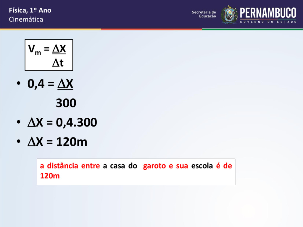 por segundo, como cada passo vale 40 cm que é igual a 0,4 m, então a velocidade média do garoto é de 0,4m/s. • O tempo do deslocamento do garoto até a sua escola é de 5 minutos e cada minuto vale 60 segundos, logo o intervalo de tempo do deslocamento é de 60.5 = 300s Física, 1º Ano Cinemática