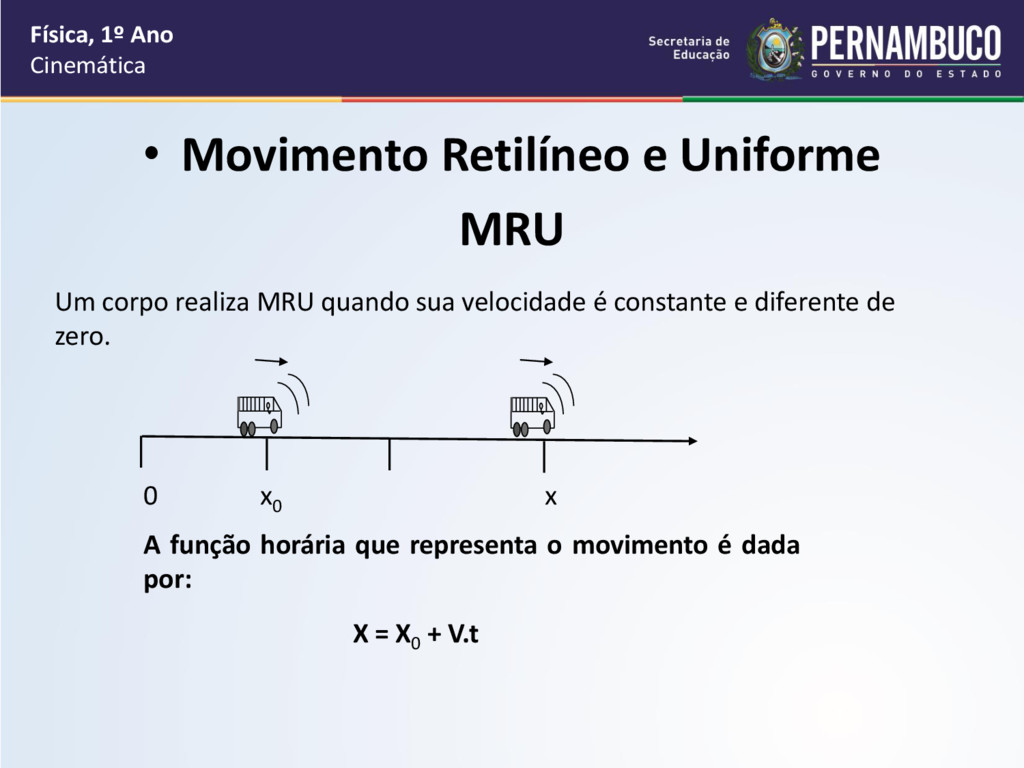 Um corpo realiza MRU quando sua velocidade é constante e diferente de zero. 0 x0 x A função horária que representa o movimento é dada por: X = X0 + V.t