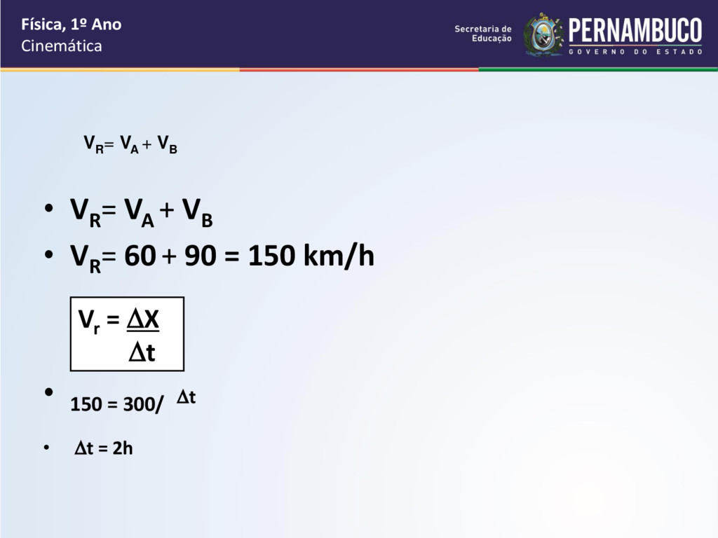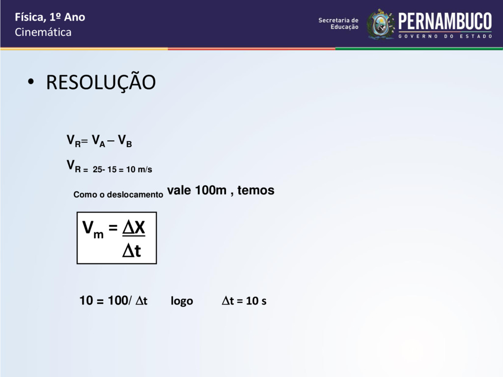 movem-se em movimento uniforme com velocidades VA = 25 m/s e VB = 15 m/s, no mesmo sentido. No instante t = 0, os carros ocupam as posições indicadas na figura. Determine depois de quanto tempo A alcança B. Física, 1º Ano Cinemática 100 m VA VB