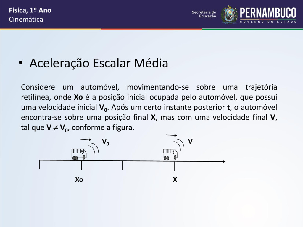 automóvel, movimentando-se sobre uma trajetória retilínea, onde Xo é a posição inicial ocupada pelo automóvel, que possui uma velocidade inicial V0 . Após um certo instante posterior t, o automóvel encontra-se sobre uma posição final X, mas com uma velocidade final V, tal que V V0 , conforme a figura. V0 V Xo X