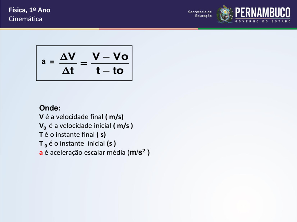 a = Onde: V é a velocidade final ( m/s) V0 é a velocidade inicial ( m/s ) T é o instante final ( s) T 0 é o instante inicial (s ) a é aceleração escalar média (m/s2 )
