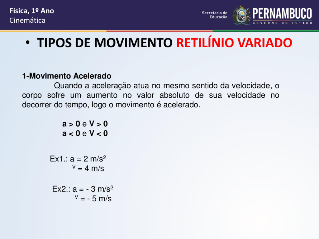 1-Movimento Acelerado Quando a aceleração atua no mesmo sentido da velocidade, o corpo sofre um aumento no valor absoluto de sua velocidade no decorrer do tempo, logo o movimento é acelerado. a > 0 e V > 0 a < 0 e V < 0 Ex1.: a = 2 m/s2 V = 4 m/s Ex2.: a = - 3 m/s2 V = - 5 m/s