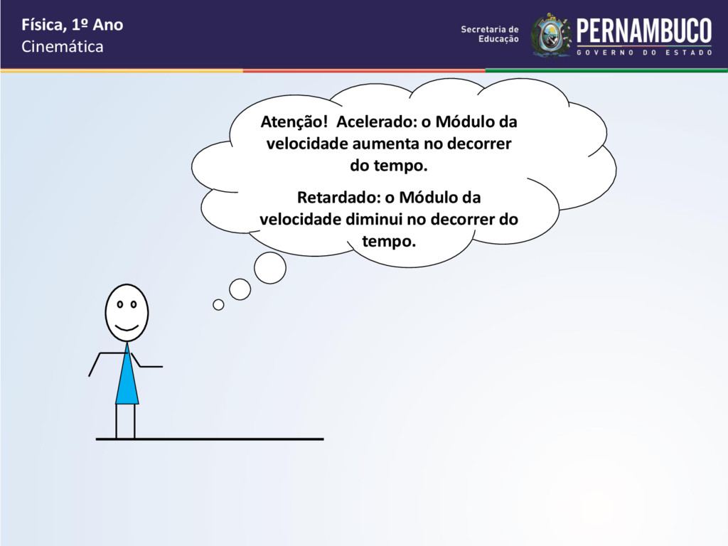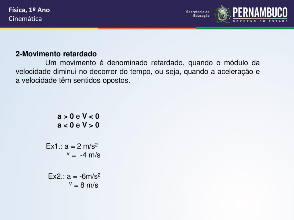 retardado, quando o módulo da velocidade diminui no decorrer do tempo, ou seja, quando a aceleração e a velocidade têm sentidos opostos. a > 0 e V < 0 a < 0 e V > 0 Ex1.: a = 2 m/s2 V = -4 m/s Ex2.: a = -6m/s2 V = 8 m/s