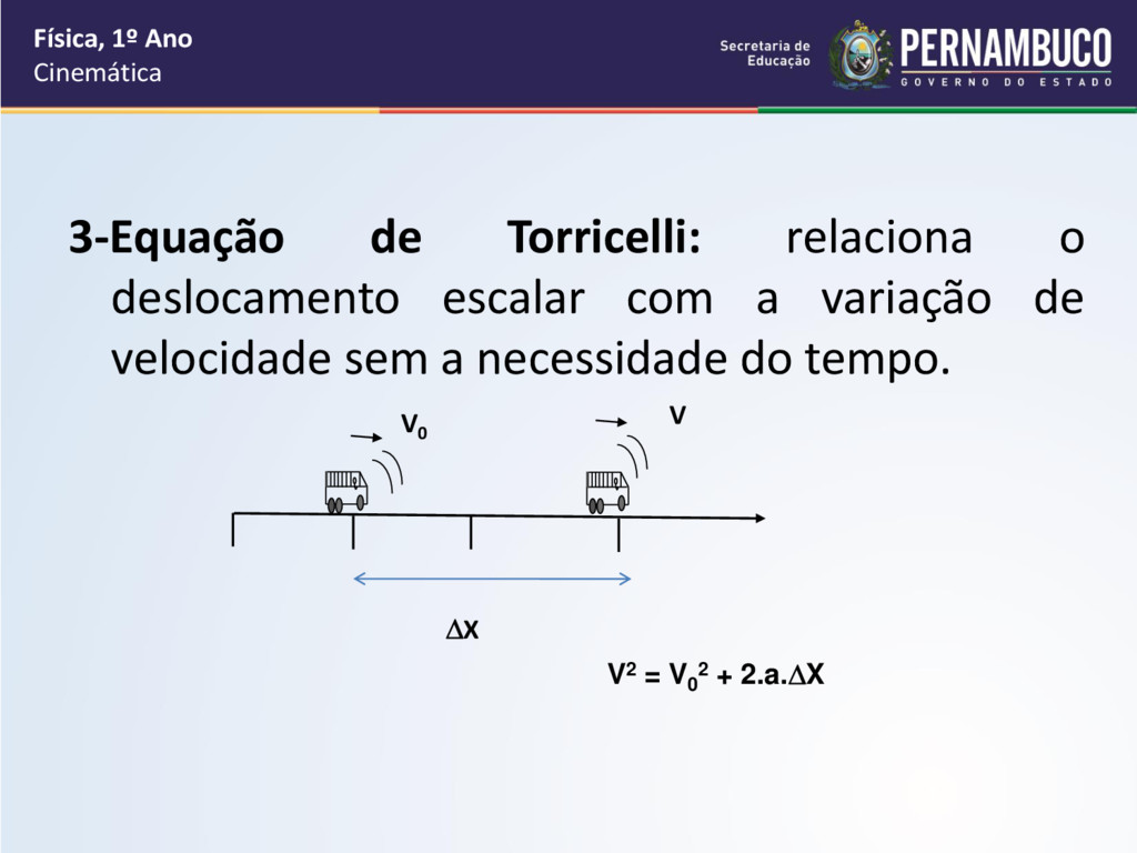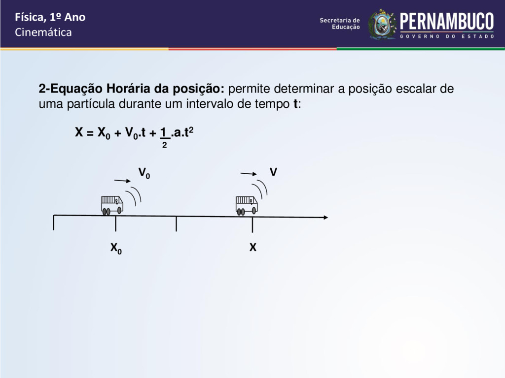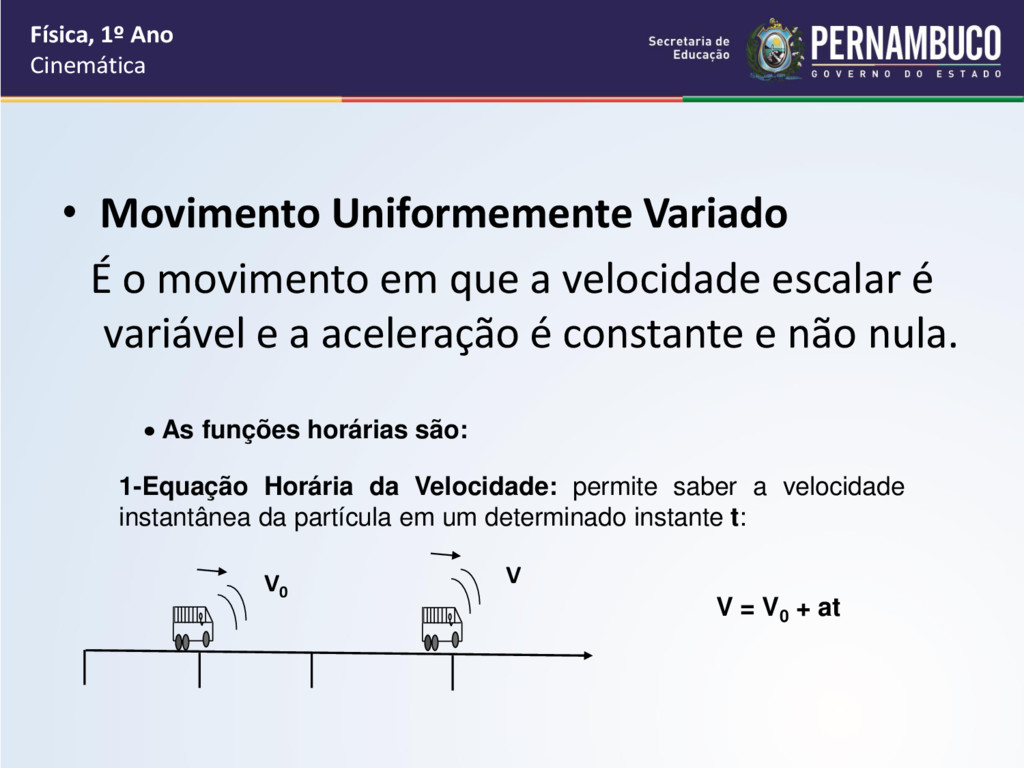 velocidade escalar é variável e a aceleração é constante e não nula. Física, 1º Ano Cinemática As funções horárias são: 1-Equação Horária da Velocidade: permite saber a velocidade instantânea da partícula em um determinado instante t: V = V0 + at V0 V