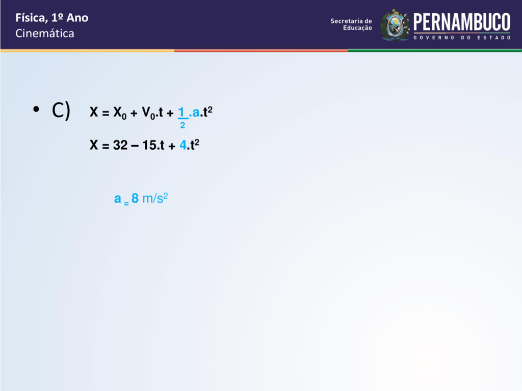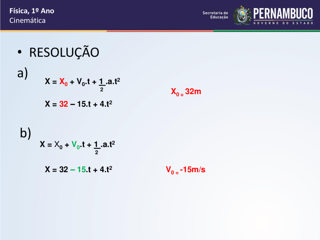 de acordo com a seguinte equação horária das posições: X = 32 – 15.t + 4.t2, em unidades do S.I.. Determine: a) A posição inicial. b) A velocidade inicial. c) A aceleração. Física, 1º Ano Cinemática