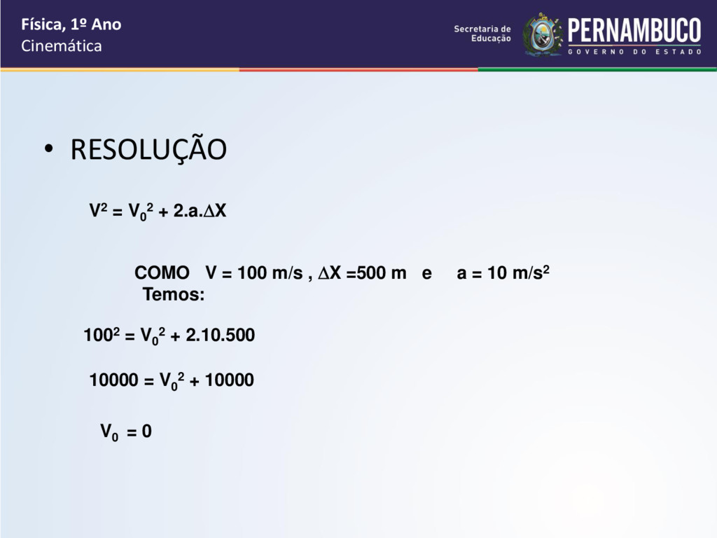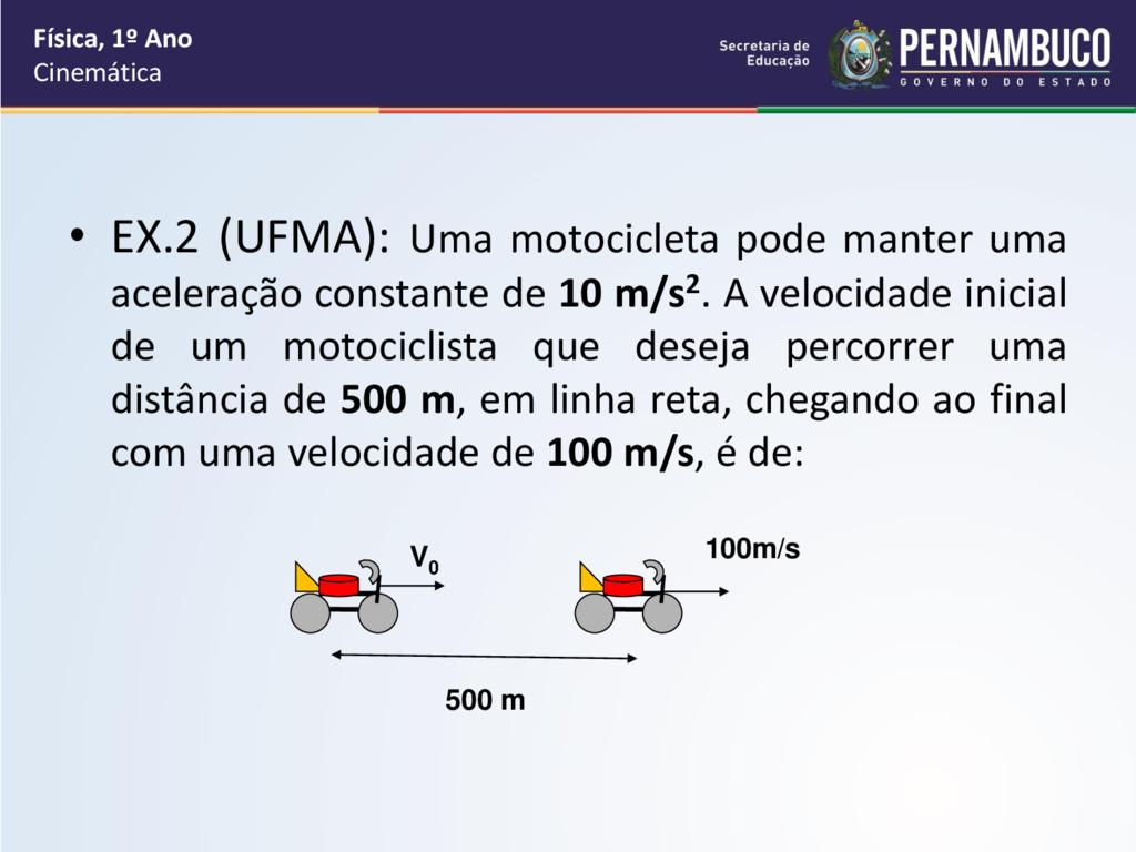 de 10 m/s2. A velocidade inicial de um motociclista que deseja percorrer uma distância de 500 m, em linha reta, chegando ao final com uma velocidade de 100 m/s, é de: Física, 1º Ano Cinemática V0 100m/s 500 m