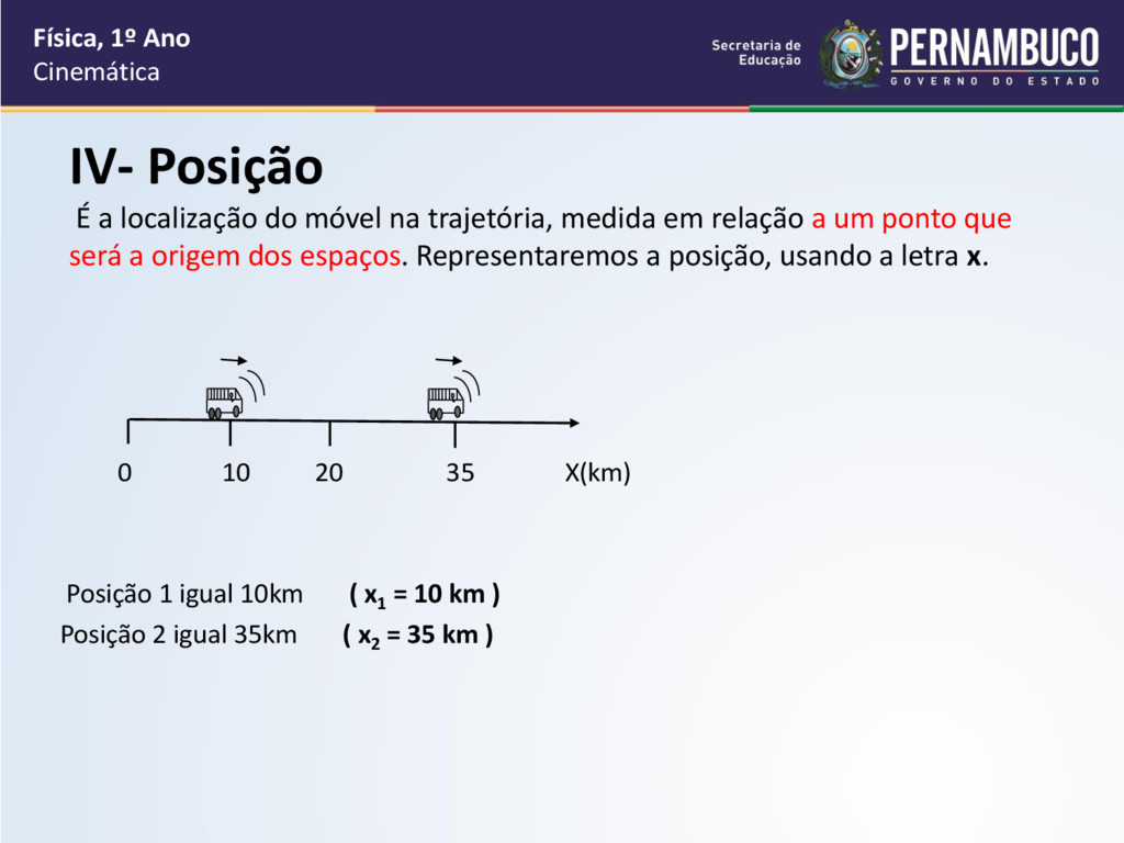 em relação a um ponto que será a origem dos espaços. Representaremos a posição, usando a letra x. 0 10 20 35 X(km) Posição 1 igual 10km ( x1 = 10 km ) Posição 2 igual 35km ( x2 = 35 km ) Física, 1º Ano Cinemática