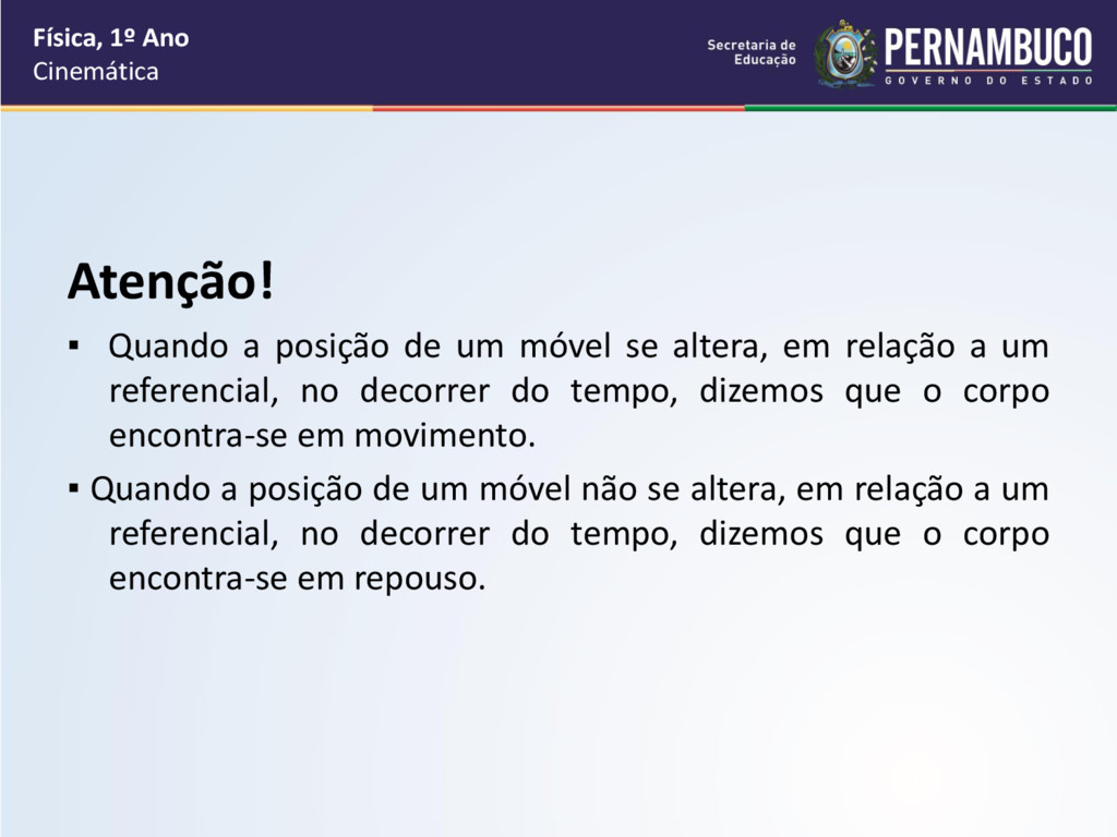 um móvel se altera, em relação a um referencial, no decorrer do tempo, dizemos que o corpo encontra-se em movimento. ▪ Quando a posição de um móvel não se altera, em relação a um referencial, no decorrer do tempo, dizemos que o corpo encontra-se em repouso.