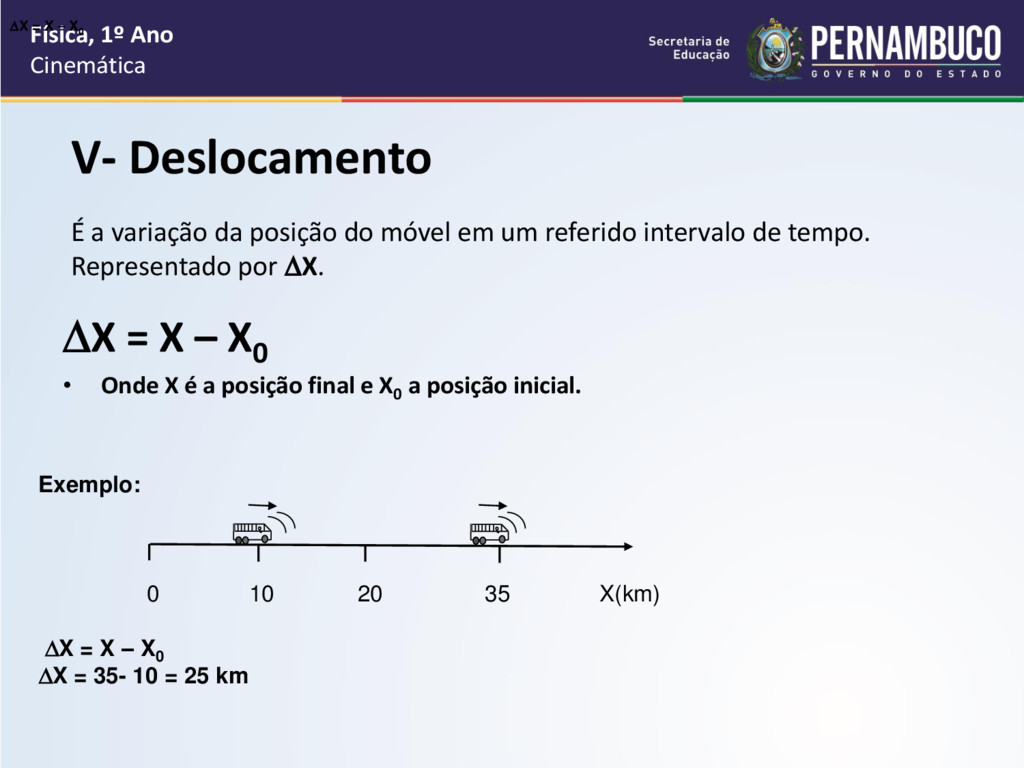 um referido intervalo de tempo. Representado por X. X = X – X0 • Onde X é a posição final e X0 a posição inicial. Física, 1º Ano Cinemática X = X – X 0 Exemplo: 0 10 20 35 X(km) X = X – X0 X = 35- 10 = 25 km