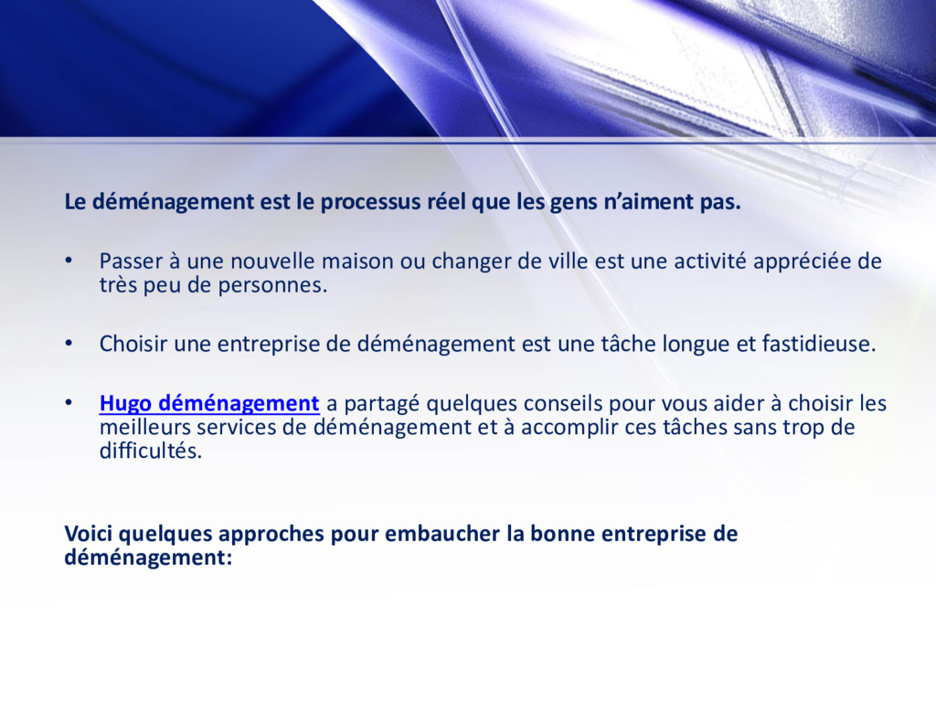 pas. • Passer à une nouvelle maison ou changer de ville est une activité appréciée de très peu de personnes. • Choisir une entreprise de déménagement est une tâche longue et fastidieuse. • Hugo déménagement a partagé quelques conseils pour vous aider à choisir les meilleurs services de déménagement et à accomplir ces tâches sans trop de difficultés. Voici quelques approches pour embaucher la bonne entreprise de déménagement: