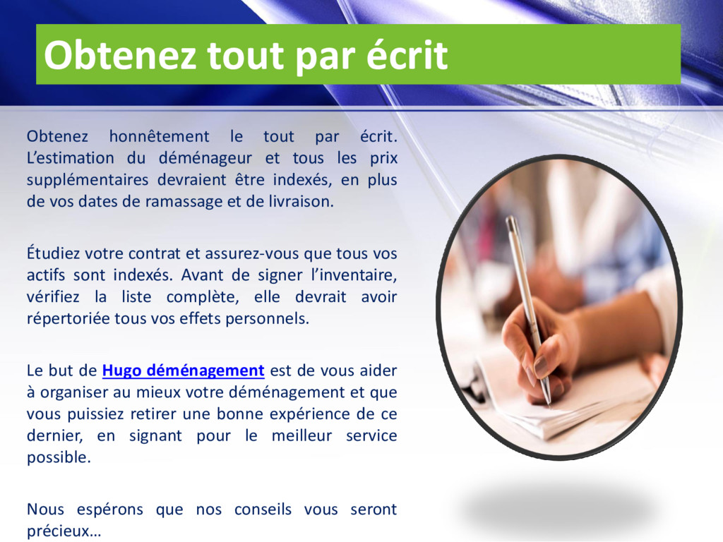 L’estimation du déménageur et tous les prix supplémentaires devraient être indexés, en plus de vos dates de ramassage et de livraison. Étudiez votre contrat et assurez-vous que tous vos actifs sont indexés. Avant de signer l’inventaire, vérifiez la liste complète, elle devrait avoir répertoriée tous vos effets personnels. Le but de Hugo déménagement est de vous aider à organiser au mieux votre déménagement et que vous puissiez retirer une bonne expérience de ce dernier, en signant pour le meilleur service possible. Nous espérons que nos conseils vous seront précieux…