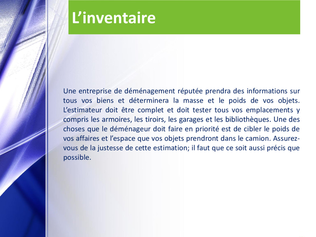 tous vos biens et déterminera la masse et le poids de vos objets. L’estimateur doit être complet et doit tester tous vos emplacements y compris les armoires, les tiroirs, les garages et les bibliothèques. Une des choses que le déménageur doit faire en priorité est de cibler le poids de vos affaires et l’espace que vos objets prendront dans le camion. Assurez- vous de la justesse de cette estimation; il faut que ce soit aussi précis que possible.