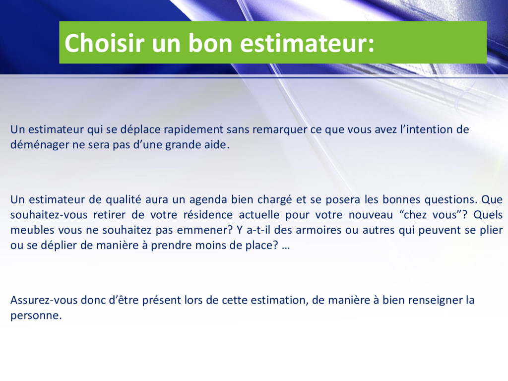 sans remarquer ce que vous avez l’intention de déménager ne sera pas d’une grande aide. Un estimateur de qualité aura un agenda bien chargé et se posera les bonnes questions. Que souhaitez-vous retirer de votre résidence actuelle pour votre nouveau “chez vous”? Quels meubles vous ne souhaitez pas emmener? Y a-t-il des armoires ou autres qui peuvent se plier ou se déplier de manière à prendre moins de place? … Assurez-vous donc d’être présent lors de cette estimation, de manière à bien renseigner la personne.