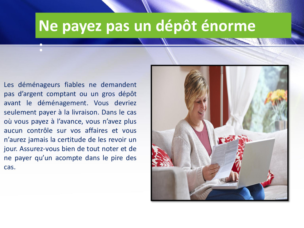 ne demandent pas d’argent comptant ou un gros dépôt avant le déménagement. Vous devriez seulement payer à la livraison. Dans le cas où vous payez à l’avance, vous n’avez plus aucun contrôle sur vos affaires et vous n’aurez jamais la certitude de les revoir un jour. Assurez-vous bien de tout noter et de ne payer qu’un acompte dans le pire des cas.