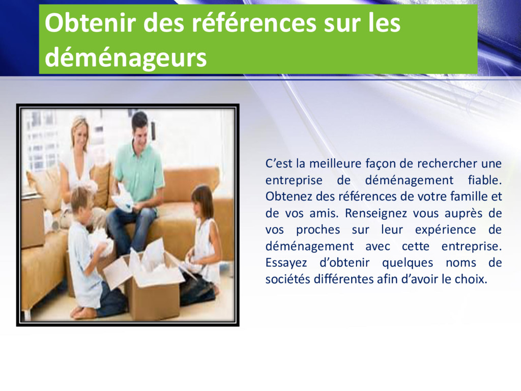 de rechercher une entreprise de déménagement fiable. Obtenez des références de votre famille et de vos amis. Renseignez vous auprès de vos proches sur leur expérience de déménagement avec cette entreprise. Essayez d’obtenir quelques noms de sociétés différentes afin d’avoir le choix.