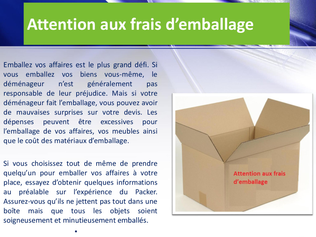 grand défi. Si vous emballez vos biens vous-même, le déménageur n’est généralement pas responsable de leur préjudice. Mais si votre déménageur fait l’emballage, vous pouvez avoir de mauvaises surprises sur votre devis. Les dépenses peuvent être excessives pour l’emballage de vos affaires, vos meubles ainsi que le coût des matériaux d’emballage. Si vous choisissez tout de même de prendre quelqu’un pour emballer vos affaires à votre place, essayez d’obtenir quelques informations au préalable sur l’expérience du Packer. Assurez-vous qu’ils ne jettent pas tout dans une boîte mais que tous les objets soient soigneusement et minutieusement emballés. •