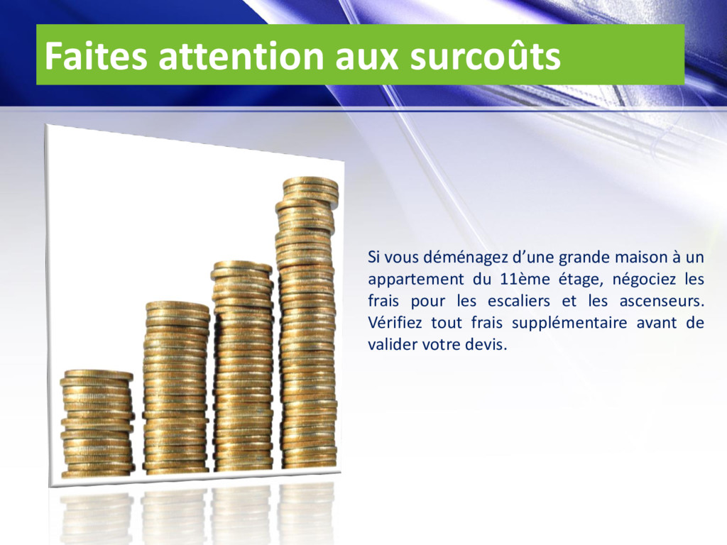 à un appartement du 11ème étage, négociez les frais pour les escaliers et les ascenseurs. Vérifiez tout frais supplémentaire avant de valider votre devis.