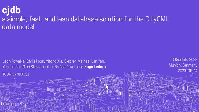 encoding 3 encodings 3DCityDB { "type": “CityJSON", "version": “1.1”, "transform": { "scale": [1.0, 1.0, 1.0], "translate": [0.0, 0.0, 0.0] }, "metadata": { "referenceSystem": "https://www.opengis.net/def/crs/EPSG/0/7415" }, "CityObjects": { "id-1": { "type": "Building", "attributes": { "measuredHeight": 22.3, "owner": “Elvis Presley" }, "geometry": [ { "type": “MultiSurface", "lod": “2.1", "boundaries": [ [[0, 3, 2, 1]], [[4, 5, 6, 7]], [[0, 1, 5, 4]] ] } ] } }, "vertices": [ [231, 2321, 11], [1111, 321, 12], ... ], "appearance": { "materials": [], "textures":[] } }