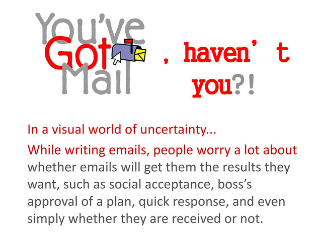 writing emails, people worry a lot about whether emails will get them the results they want, such as social acceptance, boss’s approval of a plan, quick response, and even simply whether they are received or not.