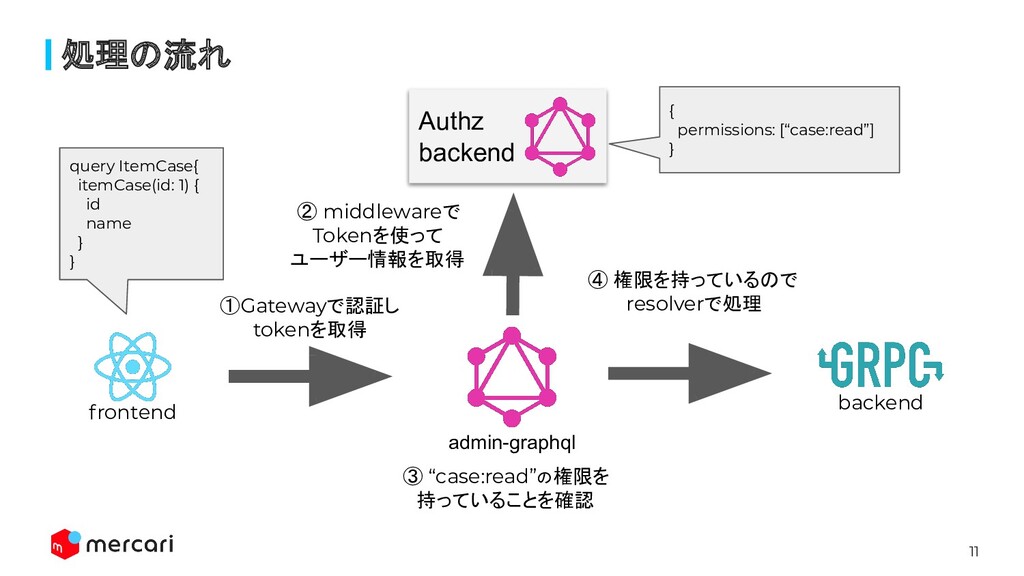 middlewareで Tokenを使って ユーザー情報を取得 ③ “case:read”の権限を 持っていることを確認 ④ 権限を持っているので resolverで処理 query ItemCase{ itemCase(id: 1) { id name } } { permissions: [“case:read”] }