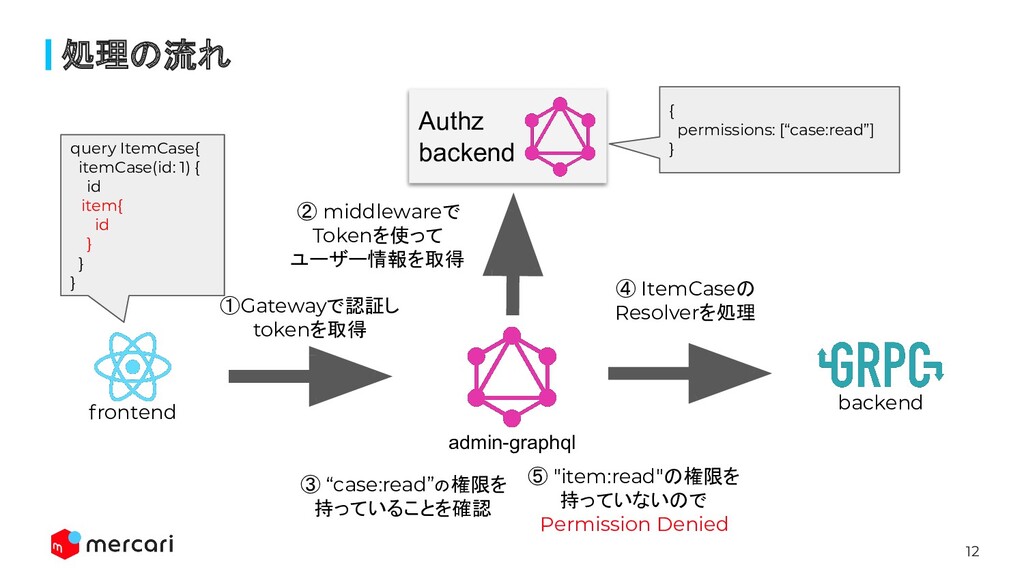 middlewareで Tokenを使って ユーザー情報を取得 ⑤ "item:read"の権限を 持っていないので Permission Denied ④ ItemCaseの Resolverを処理 query ItemCase{ itemCase(id: 1) { id item{ id } } } { permissions: [“case:read”] } ③ “case:read”の権限を 持っていることを確認