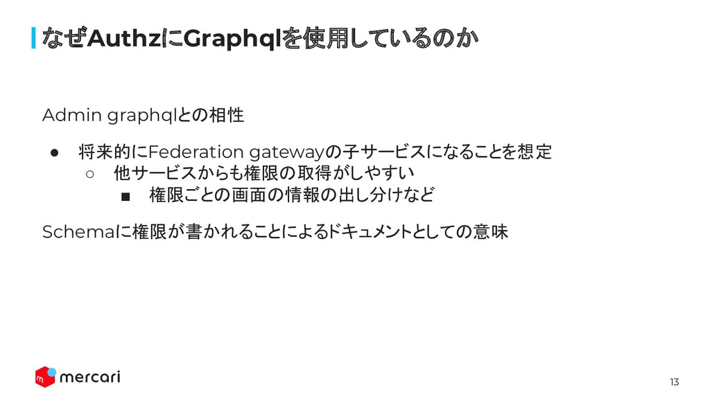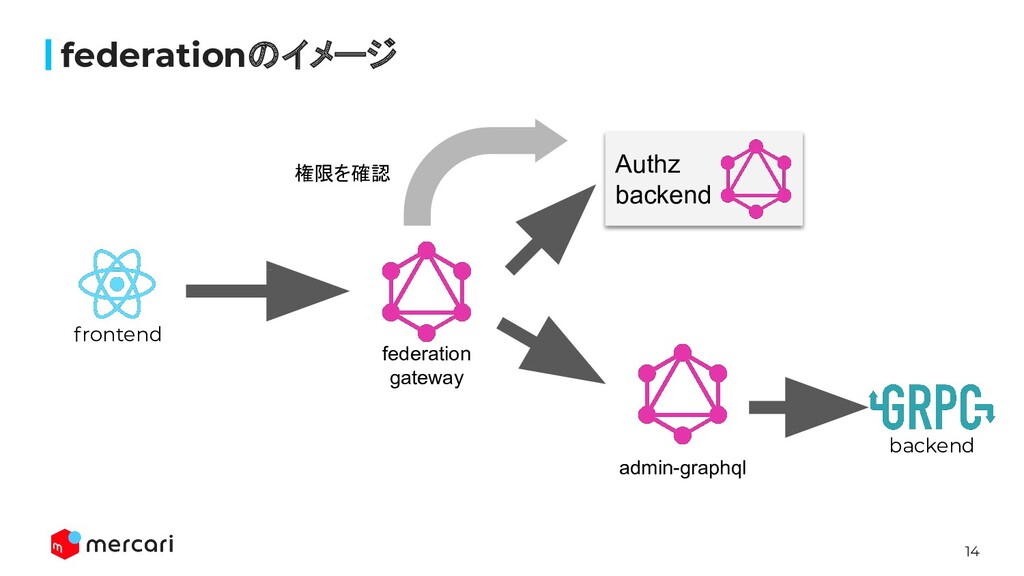 13 なぜAuthzにGraphqlを使用しているのか Admin graphqlとの相性 • 将来的にFederation gatewayの子サービスになることを想定 ◦ 他サービスからも権限の取得がしやすい ▪