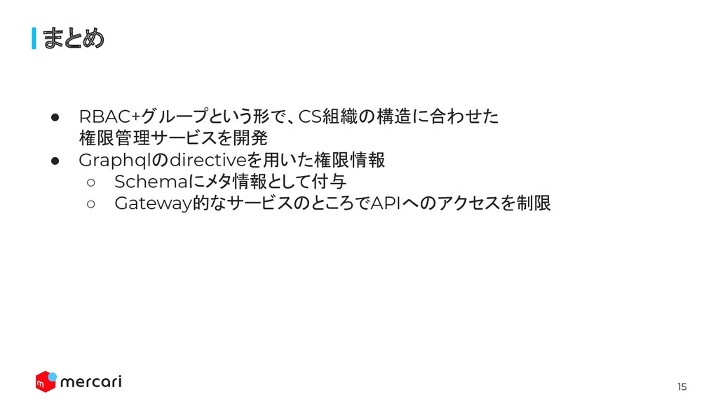 15 まとめ • RBAC+グループという形で、CS組織の構造に合わせた 権限管理サービスを開発 • Graphqlのdirectiveを用いた権限情報 ◦ Schemaにメタ情報として付与 ◦
