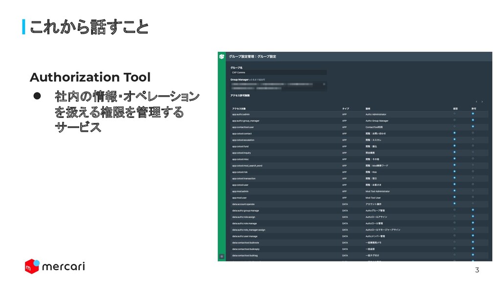 3 Authorization Tool • 社内の情報・オペレーション を扱える権限を管理する サービス これから話すこと