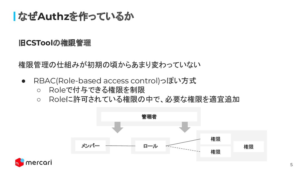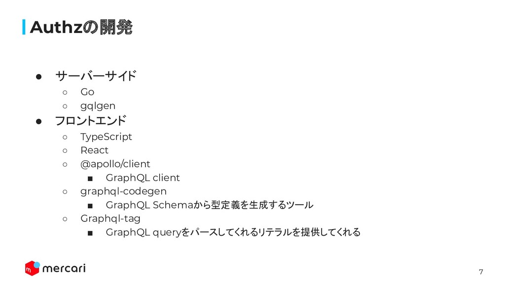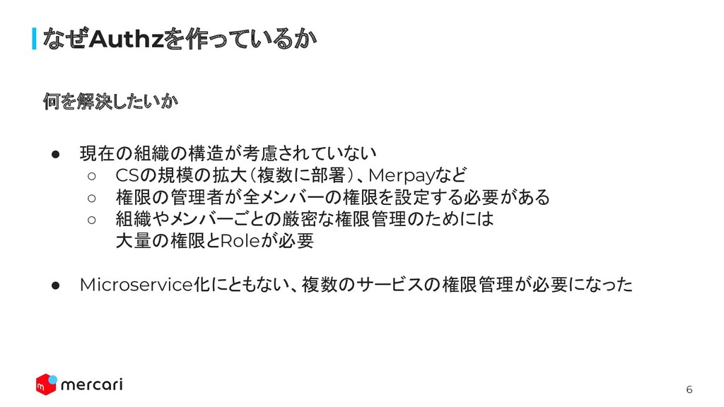 6 なぜAuthzを作っているか • 現在の組織の構造が考慮されていない ◦ CSの規模の拡大(複数に部署)、Merpayなど ◦ 権限の管理者が全メンバーの権限を設定する必要がある ◦ 組織やメンバーごとの厳密な権限管理のためには