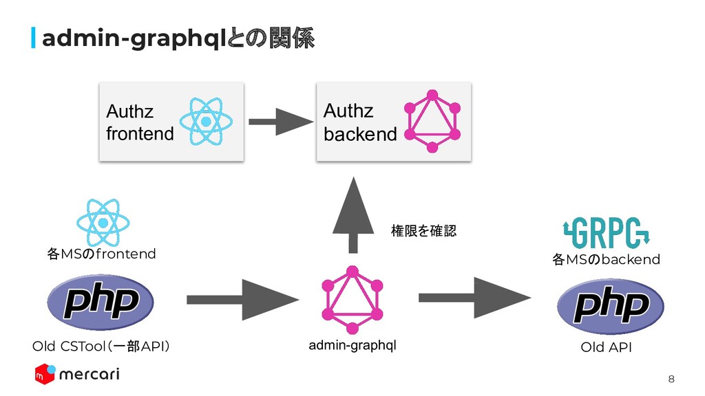 8 admin-graphqlとの関係 admin-graphql 各MSのbackend 各MSのfrontend Old CSTool(一部API) Old API 権限を確認